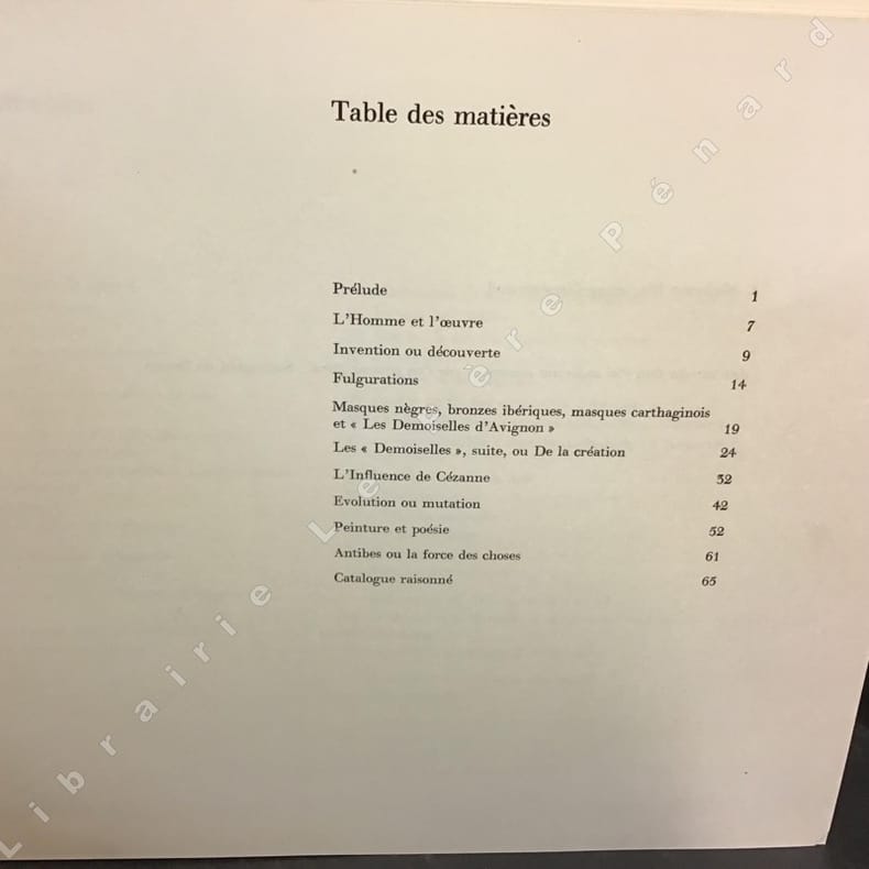 Cartonnage éditeur (310x245mm), format oblong, titre doré au dos, plat supérieur imprimé. 5ff, 65 pages, 16ff (planches en noir et bicolores non paginées), 6ff (catalogue raisonné). Accompagné de 98 illustrations. Imprimé sur papier vergé. Photographies de Marianne Greenwood (1916-2006). Le château d'Antibes acheté par la ville d'Antibes en 1927 à la condition d'y établir un musée -ce qui fut fait en 1928 sous l'appellation Musée Grimaldi (aujourd'hui Musée Picasso)- invite, sous les auspices de son conservateur Dor de la Souchère, l'immense Picasso et sa compagne Françoise Gilot. Suite à son séjour (en 1946), l'artiste y laisse 23 peintures, 14 huiles sur papier, 30 dessins, près de 80 céramiques ainsi que des sculptures, une tapisserie et un dessin mural, soit près de 149 œuvres au total. Le catalogue raisonné de l'œuvre de Picasso au Musée d'Antibes se trouve à la fin de l'ouvrage. " Le secret des grands génies est et ne peut être que dans les relations, qu'ils trouvèrent, qu'ils furent forcés de trouver entre les choses sans rapport apparent" (P. Valéry, p52) Avec son rhodoïd, étui cartonné imprimé. Très bon état, rares rousseurs.