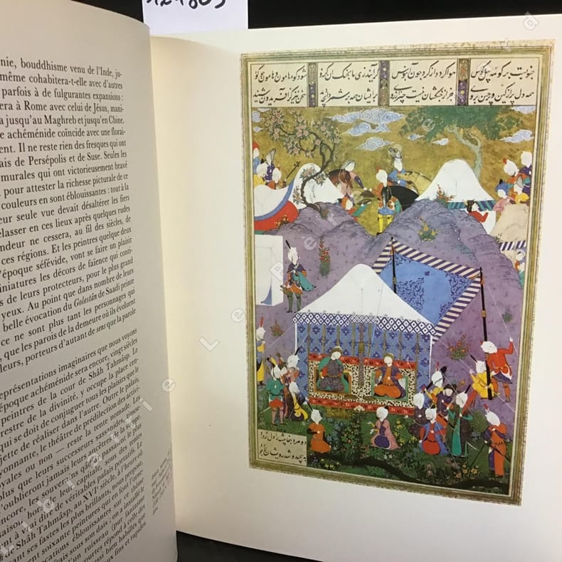 Éditions Phebus, Paris, 1983. Magnifique ouvrage de 268 pages réunissant un grand nombre de reproductions en couleurs ainsi que l'histoire de chacune de ses représentations. "La peinture persane a longtemps souffert d'un malentendu: associée pour l'essentiel à l'art de la miniature, elle s'est vue systématiquement réduite selon les principes d'une logique un peu rapide, à un art de piètre ambition, de petite dimension - quel que soit le sens que l'on veuille prêter à ce mot. Paresse de jugement de l'Occident, qui devrait pourtant se souvenir que la vraie grandeur échappe à toute mensuration." (Kevorkian et Sicre)