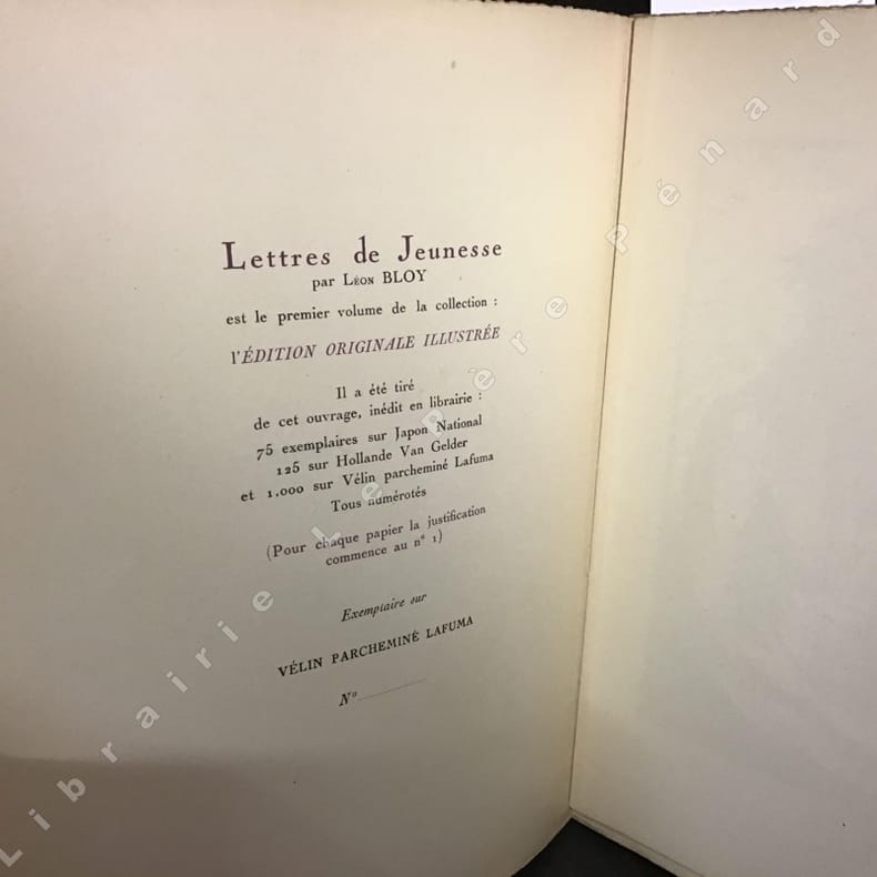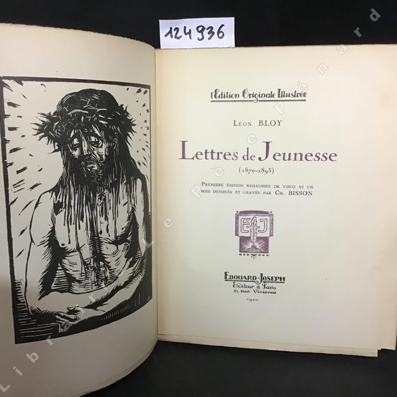 Léon Bloy, Charles Bisson (illustrateur), Lettres de Jeunesse (1870-1893). Paris, Edouard-Joseph, 1920. In-8, 142p. Edition originale de ce recueil de lettres, qui en contient 28 en tout. Il est illustré, rehaussé dit le titre, de 21 bois dessinés et gravés par Charles Bisson, artiste sur lequel on sait finalement peu de choses, mais qui peut être considéré comme l'unique illustrateur de l'oeuvre bloyenne, comme il s'en vante lui-même dans un courrier. En effet, mis à part La Femme Pauvre (édition de 1926 tirée uniquement à 115 exemplaires) et cet ouvrage, tous deux illustrés par Bisson, le seul ouvrage ayant plus qu'un frontispice est Sueur de Sang (dessins d'Henry de Groux). Un des 1000 exemplaires sur vélin. Demi-chagrin rouge à coins, dos à nerfs, tête dorée, première couverture conservée. Petits accrocs, fente en tête du mors supérieur. Bon exemplaire.