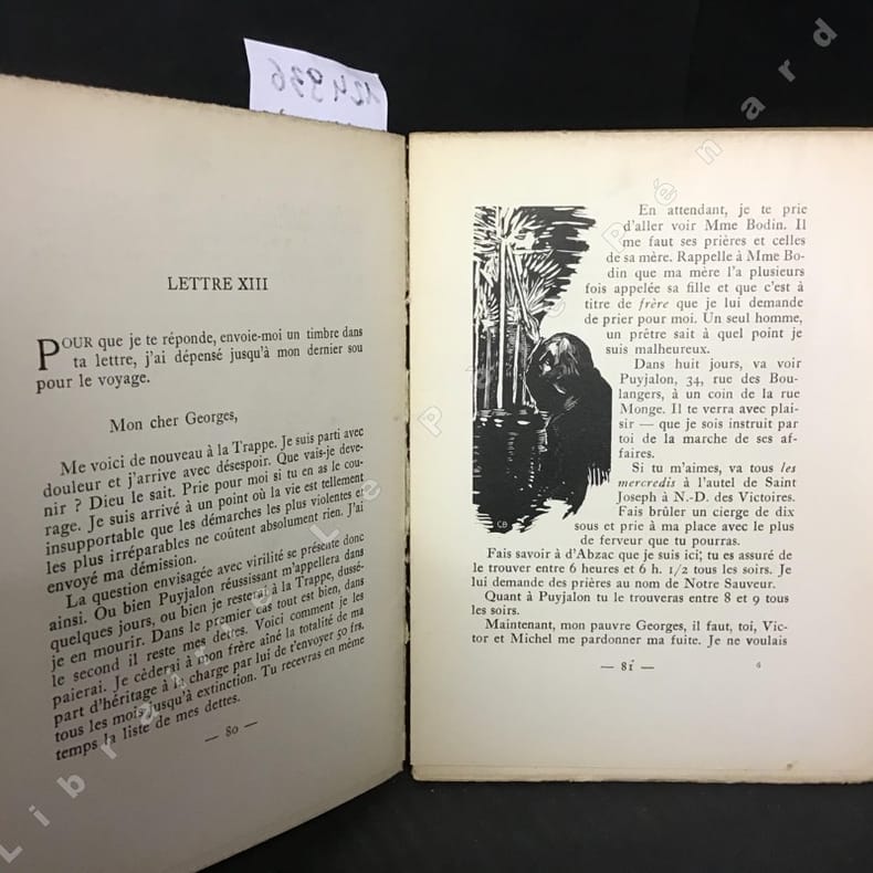 1920 Paris, Edouard-Joseph, 1920 - In-8 - Edition originale de ce recueil de lettres, qui en contient 28 - Broché, dos fragile - Grandes marges - Edition numérotée sur Vélin parcheminée, N° 852/1000 - Illustrations de 21 bois (dont frontispice) dessinés et gravés par Charles Bisson - 142 pages - Déchirure au 1 er plat, mais très frais intérieurement - JOINT EN SUPPLEMENT suite des 21 bois gravés - Bon exemplaire -Réf. 45860