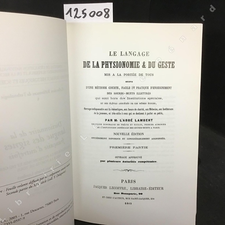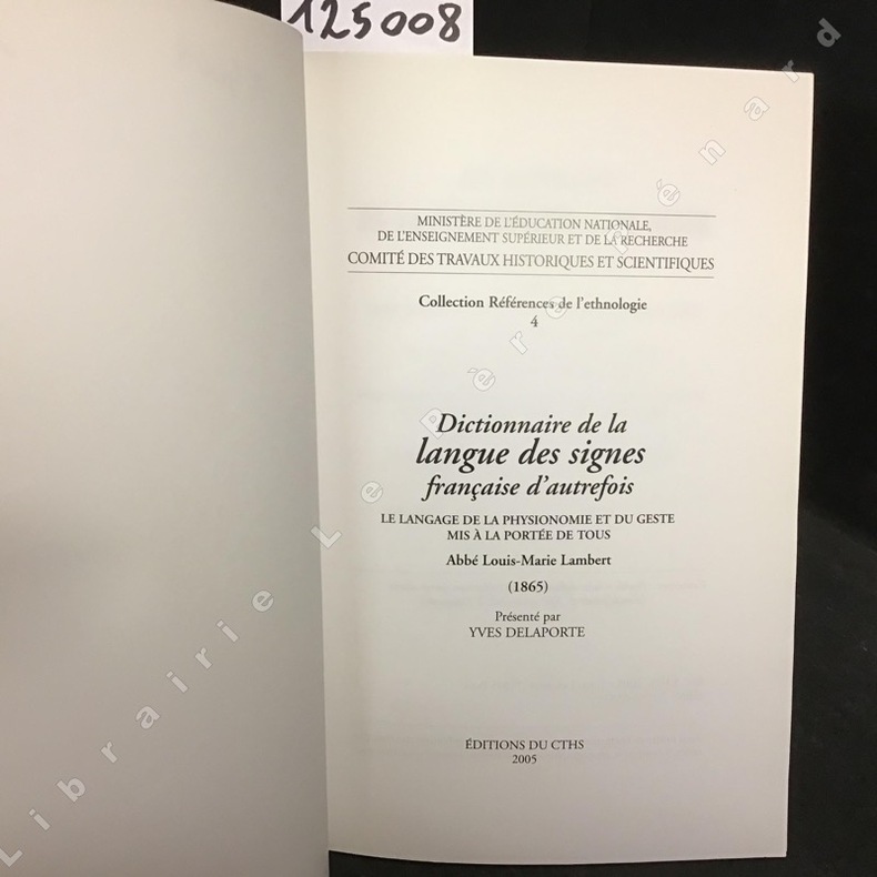 2005 Editions du CTHS - N° 4 de la collection "Références de l'ethnologie" - 2005 - In-8 broché, couverture illustrée - 394 pages - Fac-similé de l'édition de 1865 intitulé "Le langage de la physionomie et du geste mis à la portée de tous suivi 'une méthode courte, facile et pratique d'enseignement des sourds-muets illettrés quui sont hors des Institutions spéciales, et des élèves arriérés de ces mêmes écoles, Ouvrage indispensable aux Ecclésiastiques, aux Soeurs de charité, aux Médecins, aux Instituteurs de la jeunesse, et très-utile à ceux qui se destinent à parler en public, par M. l'Abbé Lambert. Nouvelle édition entièrement réfondue et considérablement augmentée. Première Partie" - Illustrations en N&B, in et hors-texte, dans l'ouvrage