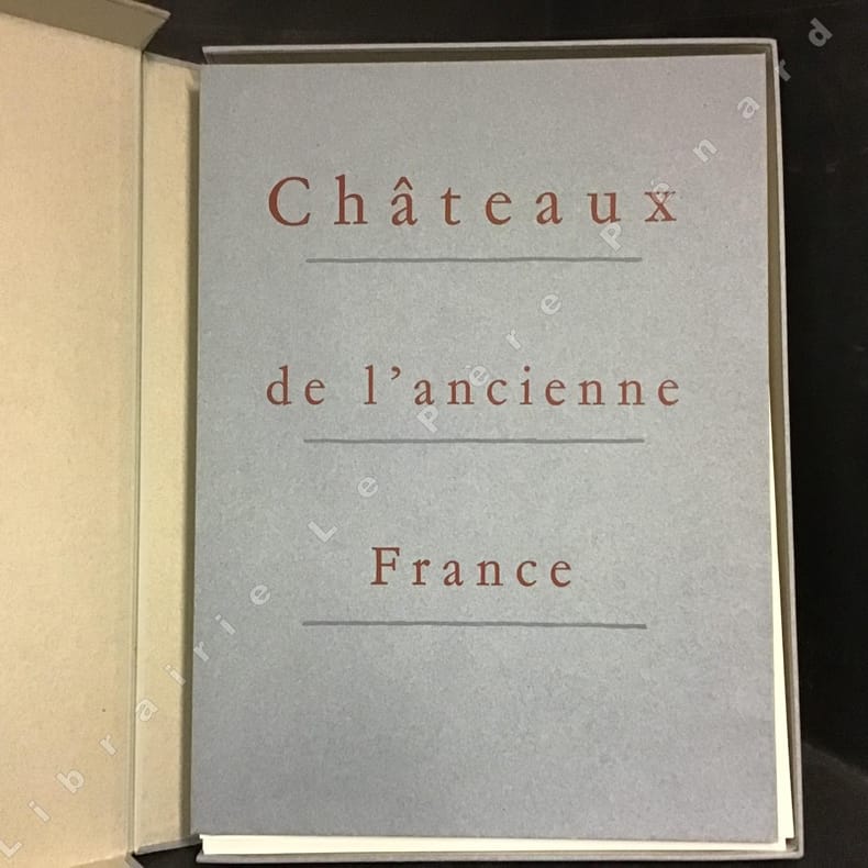 Paris Editions du Crédit Lyonnais, Editions du Chêne 1957. In-4 en feuilles sous chemise et coffret cartonné. 8 feuillets de texte imprimés sur vélin Robertsau des Papéteries Prioux et 80 planches imprimées sur vélin supérieur des Papéteries Compas représentant des châteaux, d'après des gravures anciennes dont 17 en couleurs. Edition originale réservée aux "Amis du Crédit Lyonnais". Menus défauts sur les angles du coffret.