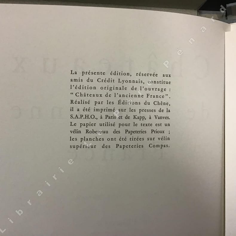 Préface d'André Maurois de l'Académie Française. La présente édition constitue l'édition originale de l'ouvrage. Réalisé par les Editions du Chêne, il a été imprimé sur les presses de la S.A.P.H.O., à Paris et de Kapp, à Vanves. Le papier utilisé pour le texte est un vélin Robertsau des Papeteries Prioux; les planches ont été tirées sur vélin supérieur des Papeteries Compas. Classification Dewey : 728.8-Château
