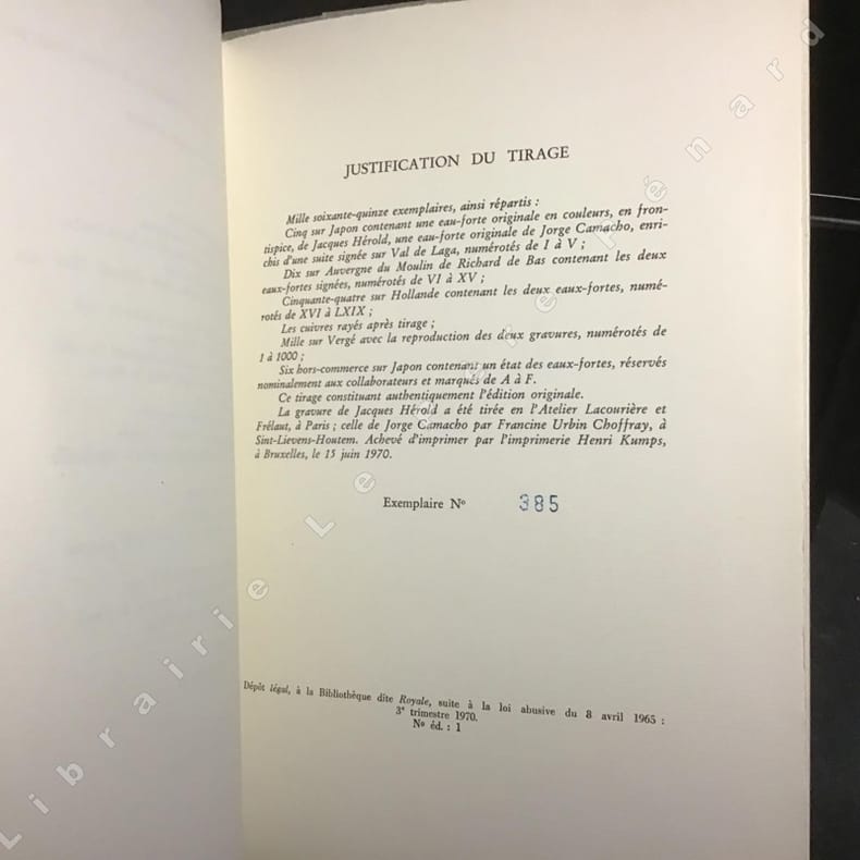 1970 Bruxelles - 1970 - In-8, feuillets non reliés - 67 pages + justification de tirage - L'un des 54 exemplaires sur Hollande contenant les deux eaux-fortes, une en couleur signée par Hérold et une en N&B signée par Camacho, numéroté LIX (troisième papier après 5 Japon et 10 Auvergne), constituant l'édition originale - Belles illustrations en contrecollées dans l'ouvrage