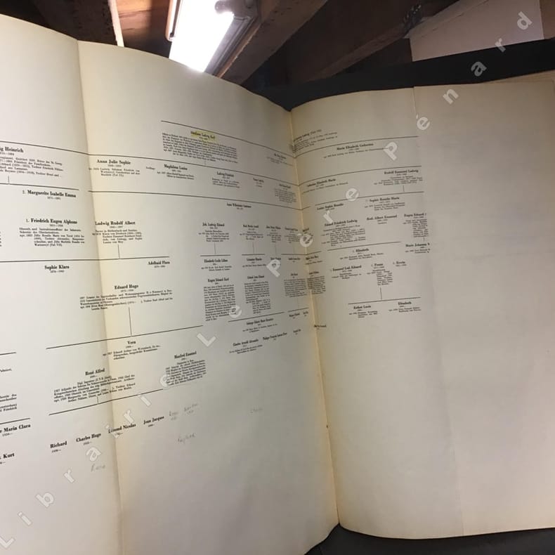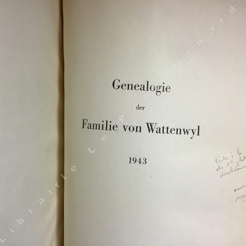 1943 Satz und Druck : Buchdruckerei K. J. Wyss Erben Aktiengesellschaft, Bern - Einband : Buchbinderei H. Schumacher's Wwe., Bern - Wapen-Zeichnung : Kunstmaler Paul Boesch, Bern - 1943 - Grand in-folio, reliure pleine toile, armoirie et devise sur le premier plat en rouge - Ouvrage limité à 150 exemplaires numéroté, celui-ci porte le numéro 64 - Ouvrage constitué d'une préface et de 13 tableaux généalogiques en double page dépliantes - Texte en allemand - Il est joint avec cette ouvrage une traduction en français de la préface et divers documents annexe en photocopie