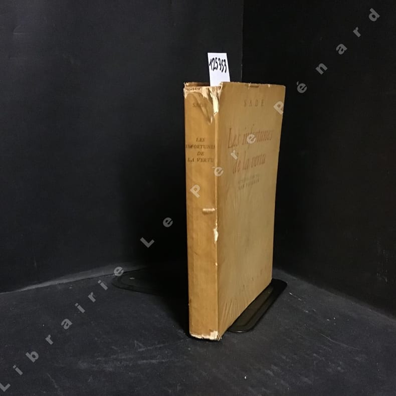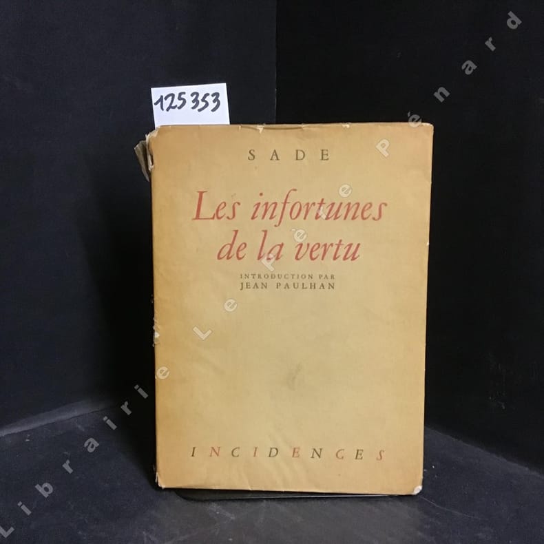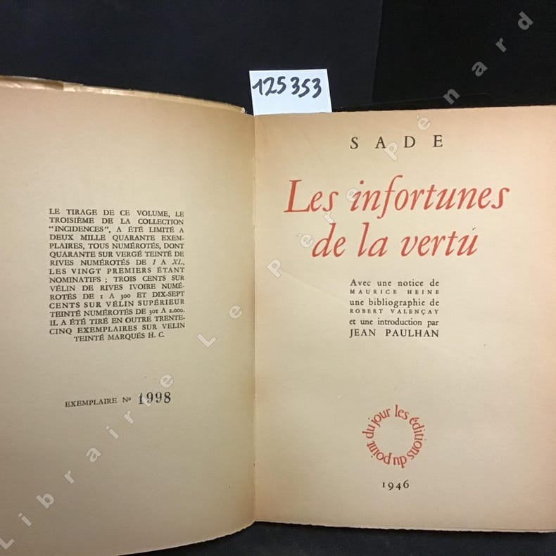 Paris Éditions du Point du Jour, coll. "Incidences" 1946 1 vol. relié in-8, reliure à la bradel de toile rouge, dos et plats de papier marbré vert, rouge et blanc, pièce de titre de maroquin havane au dos avec, en pied, une pièce de même maroquin indiquant l'année d'édition et le nom de Paulhan, doublures et gardes de papier vert olive, tête dorée, non rogné, couvertures et dos conservés (Honnelaître), XLIII + 242 pp. Édition originale de la longue introduction de Jean Paulhan. Un des 300 exemplaires numérotés sur vélin de Rives ivoire, celui-ci enrichi d'un envoi autographe signé de Paulhan au libraire Max-Philippe Delatte en page de faux-titre : "Les infortunes de la vertu ou Le Pire est l'ennemi du mal". Ex-Libris gravé Delatte. En parfaite condition.