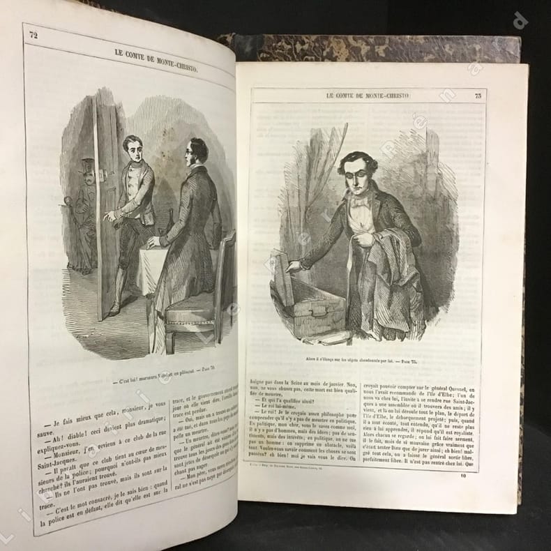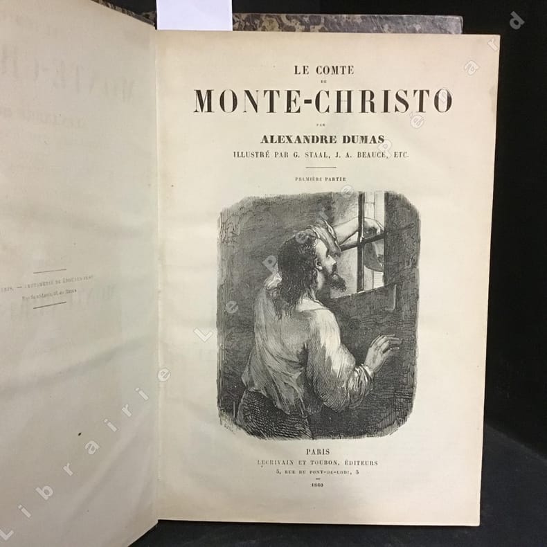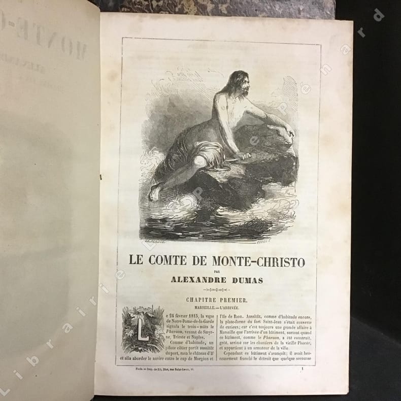 Très rare exemplaire illustré de l'édition du Journal "Le Siècle", l'une des toutes premières éditions du Comte de Monte-Cristo. Publiée dans le cadre des "Oeuvres complètes d'Alexandre Dumas" dans le Supplément au Journal "Le Siècle", cette édition parut immédiatement après la publication en feuilleton dans "Le Journal des Débats" d'août 1844 à janvier 1845 et après l'édition originale publiée en 1845-1846 par Baudry et Pétion. Elle est probablement contemporaine de l'édition de l'Echo des Feuilletons, présentée habituellement comme la première édition illustrée, publiée en deux volumes en 1846 et illustrée des 30 planches hors textes (frontispice et 29 pl.) par Gavarni et Tony Johannot, que l'on retrouve, à grands marges, dans le présent exemplaire. L'édition de l'Echo des Feuilletons est de format sensiblement plus réduit (grand in-8, 16 x 25 cm), l'édition du Siècle étant de format in-4 (21 x 29,7 cm en marges). On notera que si la page de titre publiée a posteriori orthographie correctement "Monte-Cristo", les titres et les en-têtes des numéros l'orthographient "Monte-Christo". Bon exemplaire bien complet (sans la plupart des serpentes, indication de tomaison "1", l'ouvrage correspondant au tome premier des Oeuvres complètes, qq. petits frott. et rouss. mais bel état général, rare pour cette édition).