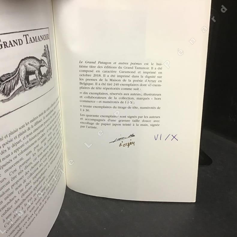 2018 Editions Le Grand Tamanoir - 2018 - In-8 broché, couverture illustrée à rabats - 172 pages - Ouvrage tiré à 240 exemplaires, celui-ci est l'un des 10 exemplaires réservés aux auteurs, illustrateurs et collaborateurs de la collection, numéroté VI/X, signés par les auteurs et accompagné d'une gravure taille douce avec encollage de papier japon teinté à la main, signée par l'artiste (premier papier) - Avec un envoi (dédicace) de Jean-Pierre Lassale et de Christian d'Orgeix sur la page de garde