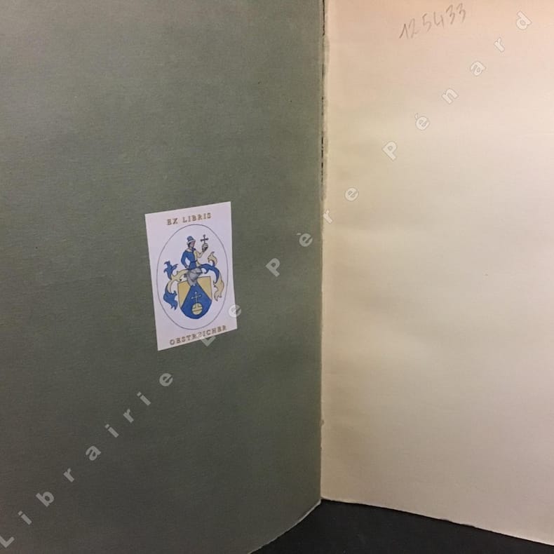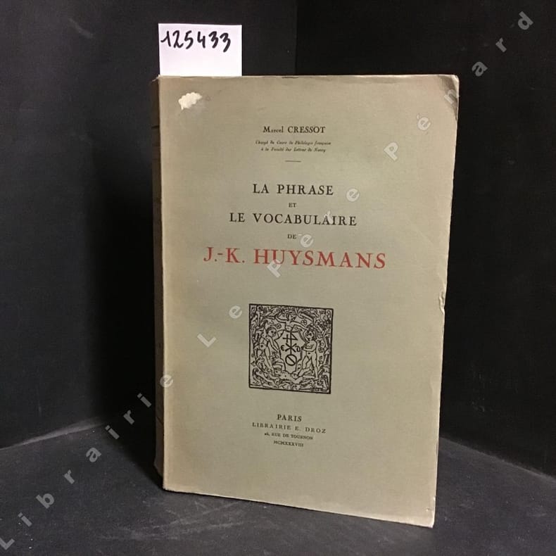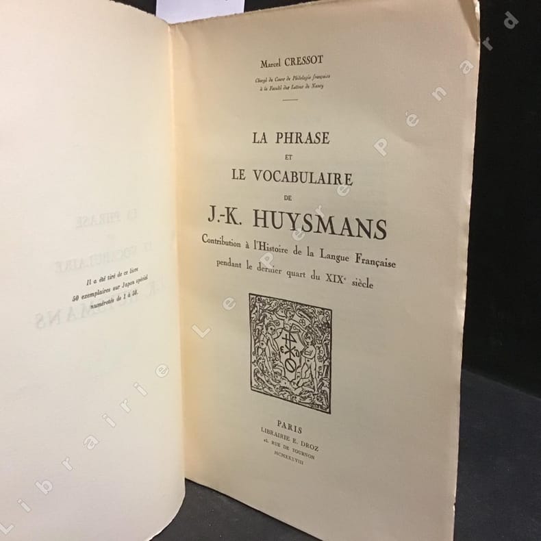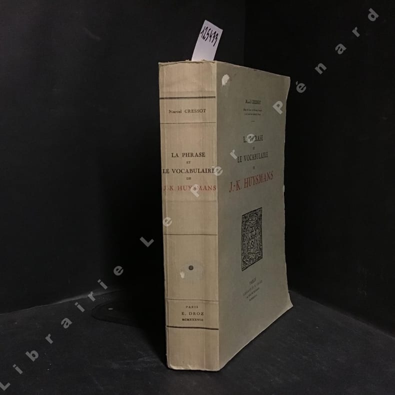 Paris, librairie E. Droz, 1938, in-4, XIII-604-[2] pp, demi-maroquin brun à coins, dos lisse, tête dorée, couverture et dos conservés, Édition originale de cette étude systématique et consciencieuse du style littéraire de Huysmans. Très bel exemplaire ; un des 50 exemplaires numérotés sur papier Japon spécial (n° 11), celui-ci enrichi en outre d'un envoi signé de l'auteur à l'écrivain français René Lalou (1889-1960). Étiquette ex-libris d'Auguste Martin. Excellent état. Couverture rigide