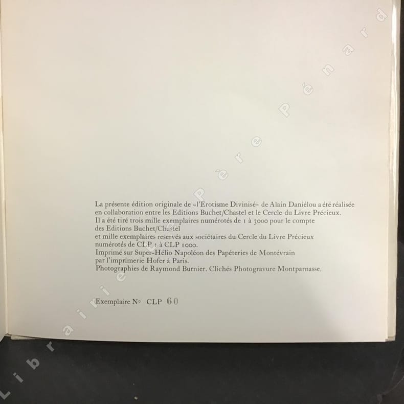 Paris, Buchet Chastel, Paris, Buchet Chastel1962 ; album in-4 , cartonnage éditeur, jaquette illustrée. - 115 pp., 1f. - ÉDITION ORIGINALE tirée à 3000 exemplaires numérotés. Nombreuses illustrations photographiques. Photographies de R. BURNIER. Etude sur les sculptures érotiques des temples hindous, le culte du phallus et de la mère, l’emblème phallique de Shiva, morale et sexualité, prostitution, homosexualité masculine, liens de la nature et libération, éducation sexuelle et érotique, symboles, représentations érotiques, sites.