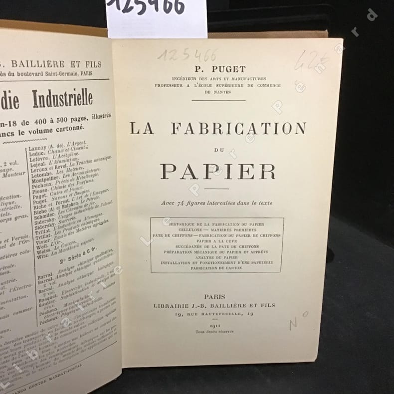 Paris, Librairie Polytechnique CH. Béranger, 1902, PREMIERE EDITION, en français traduit de la Seconde édition anglaise par L. Desmarest, in-8, cartonnage toilé bordeaux avec texte doré sur premier plat et dos lisse éd., XIV - 388 pp., 82 figures in-texte et nb. tableaux, bien complet des 2 planches dépliables, Table des matières, Bibliographie, Table alphabétique, Toute la technique pour la fabrication du papier : la cellulose, les traitements des différentes fibres, le blanchiment, fabrication du papier à la cuve et à la machine, le satinage, la coupe. La traduction de l'anglais fut effectuée par L. Desmarest, directeur des Paapeteries de G. Maillet à Thiers (Puy-de-Dôme). Remarquable ouvrage ! Pas courant. Très bon état du papier; la couverture présente quelques décollements de la toile dû à d'anciennes mouillures, mais sont altéré le texte et elle a gardée toute sa couleur et sa fraîcheur