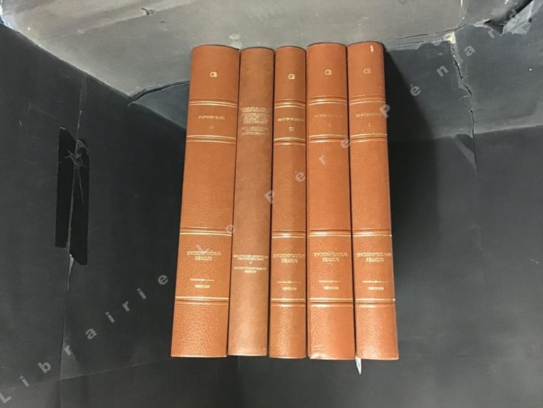 1981 Lausanne, Editions Piantanida - 1981 - 5 volumes grand in-4, reliures plein Skivertex noisette, dos à 4 nerfs avec filets, auteur et titre en doré - 600 planches couleurs dans les 3 premiers tomes + 299 et 362 pages de textes