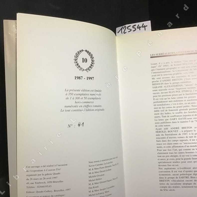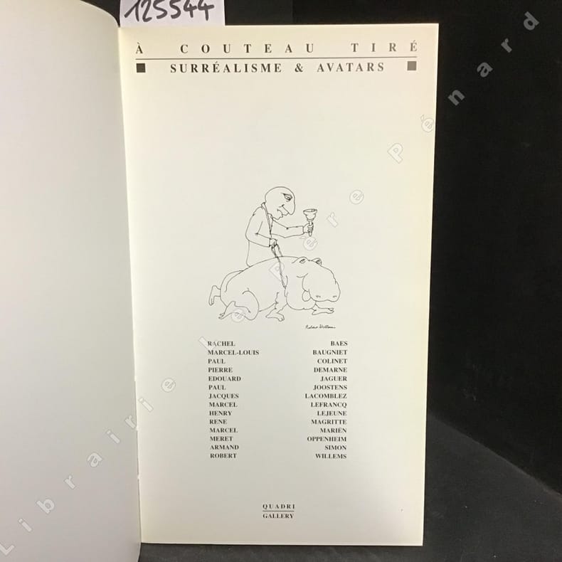 Bruxelles. Quadri Gallery, 1997. In-4 étroit br. Jaquette photo. Catalogue de l'exposition A couteau tiré qui a eu lieu du 26 mars au 26 avril 1997. Conception et notices de Ben Durant. Artistes exposés : R. Baes, P. Colinet, Ed. Jaguer, J. Lacomblez, J. Lefrancq, R. Magritte, M. Mariën, M. Oppenheim, A. Simon, etc. Reproductions. Textes de P. Demarne et Edouard Jaguer sur André Breton. E.O. 1/50 ex. num. Carton d'invitation joint. Signature autographe de Pierre Demarne et du photographe Jean-Pol Stercq.