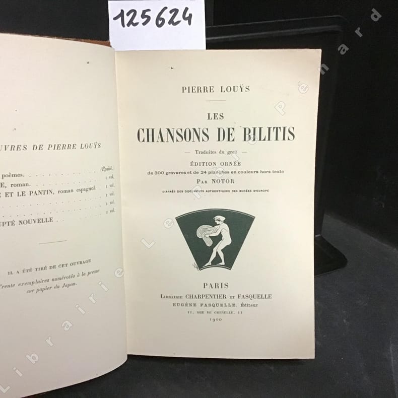 Les Chansons de Bilitis est une uvre poétique publiée en 1894. L'ouvrage se donne comme une traduction du grec, due à Pierre Louÿs, de l'uvre d'une poétesse antique du nom de Bilitis, à laquelle sont attribués ces poèmes érotiques et passionnés. L'ouvrage est précédé d'une Vie de Bilitis, retracée par le traducteur et accompagnées de plusieurs pages de notes. En fait, les poèmes sont bien de la main de Pierre Louÿs. Merci de nous contacter à l'avance si vous souhaitez consulter une référence au sein de notre librairie.