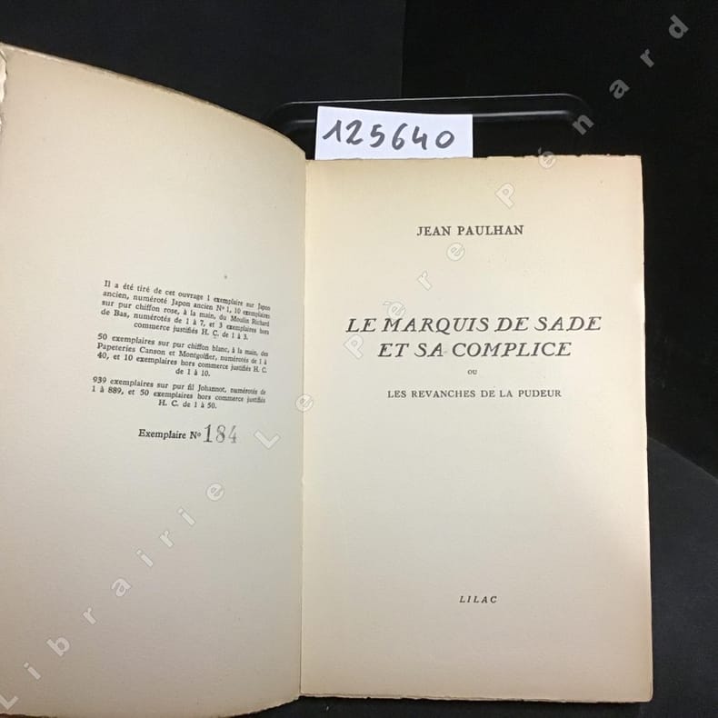 Paris: Les Editions Lilac, 1951.Softcover broche. Limited edition no. 758/939,Edition originale.Étude de Jean Paulhan (1884-1968) sur le divin marquis, qui a écrit "l'évangile du mal" et influencé au même titre que la Bible, toute la littérature. "La complice" de Sade, n'est autre que Justine, qui fut "une femme heureuse", point sur lequel Paulhan est catégorique et sur lequel la "critique devrait finir par se faire une raison".