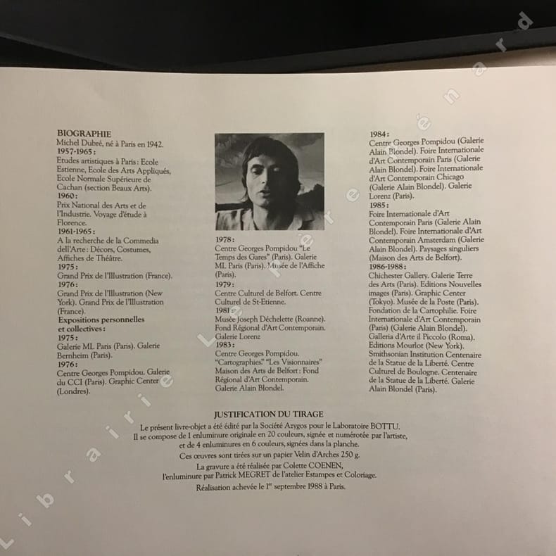 1988 Société Azygos pour le Laboratoire Bottu - 1988 - In-folio à l'italienne, feuillets non reliés, dans un coffret toilé avec une ouverture en plexiglass - Ce livre-objet est composé de 1 enluminure en 20 couleurs, numéroté 18/100 et signé par l'artiste, et de 4 enluminures en 6 couleurs, signées dans la planche - Tiré sur papier Velin d'Arches 250g