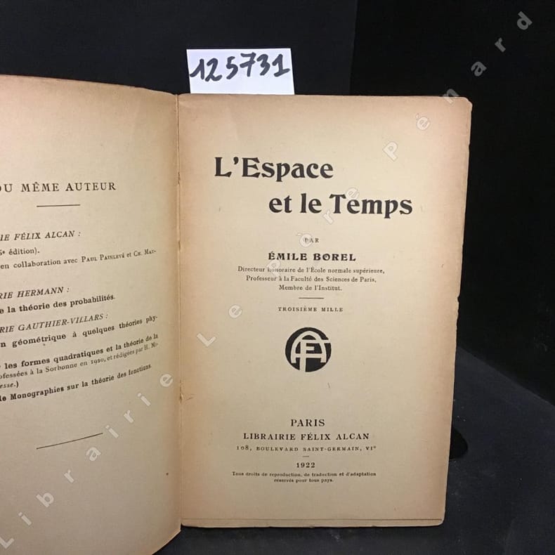 Première édition. Contient: L’Espace géométrique - Le temps et l’espace en mécanique, cinématique, dynamique. - La géométrie de notre univers - Les problèmes des mondes semblables et de la réversibilité de l’univers - Critique de l'infini et du continu, les arguments de Zénon d'Elée - La nature du Temps.