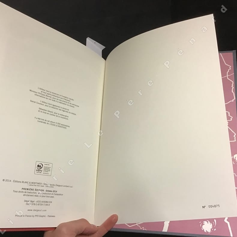 2014 Editions Blake et Mortimer / Studio Jacobs - 2014 - In-4, cartonnage illustré en couleurs, dos muet rouge imitation toilé - 64 planches en couleurs - Réédition de l'histoire telle qu'elle fût publiée dans le journal Tintin précédée de 16 pages de croquis de recherche issus des archives Jacobs - Tirage de 5000 exemplaires numérotés (N° 004875)