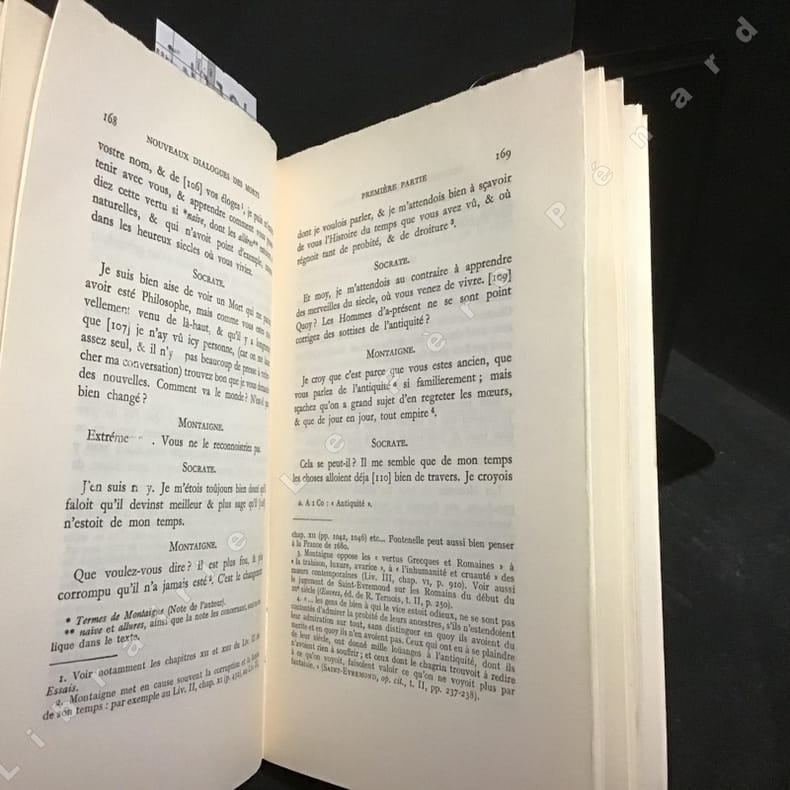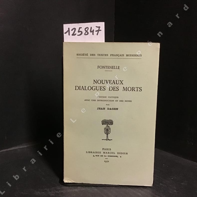 L'exemplaire - complet en tant que tel - s'ouvre sur une jolie vignette figurative gravée en page de titre. ''Que disent les Nouveaux Dialogues des Morts ? Que des morts, issus de tous pays et siècles, savent plier l'esprit au même art de raisonner. Qu'ils incarnèrent des manières de penser et d'agir dont les motifs trop humainement invariables interdisent à l'Histoire de se donner un sens. Qu'il n'y a pas lieu d'inventer doctrines, systèmes, mythes et religions pour expliquer ce qui ne résulte que des lois de la nature, connues ou connaissables. Que se réclamer de valeurs supposées transcendantes pour imposer son pouvoir engendre toujours injustice et souffrance. Qu'il est en conséquence recommandé de rire des productions éternelles et dérisoires du faux et de l'imaginaire.'' Angles et coiffe de tête élimés. Légère desquamation affectant les plats ; le premier présente un petit manque superficiel en marge inférieure. Très rares rousseurs ou tâches dans le corps d'ouvrage. Du reste, bonne condition.