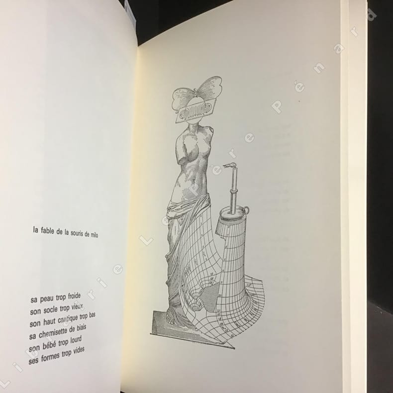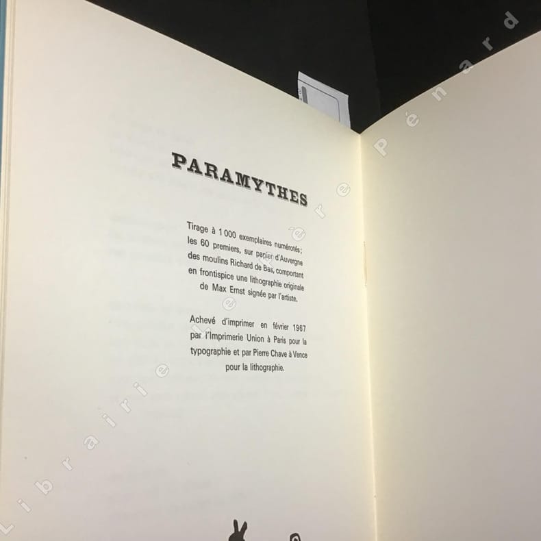 1967, Le Point Cardinal, Paris. In-8, broché bleu turquoise, premier plat illustré, 28 pages non numérotées. Huit poèmes traduits de l'allemand par Robert VALENÇAY "avec le concours de l'auteur" accompagnés de huit collages d'Ernst reproduits pleine page. En frontispice, reproduction contrecollée de la lithographie jointe avec les 60 premiers exemplaires. Un des mille exemplaires. Quelques marques du temps sans incidence sur le charme de l'objet. Intérieur frais.