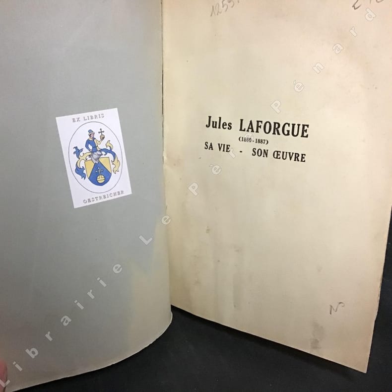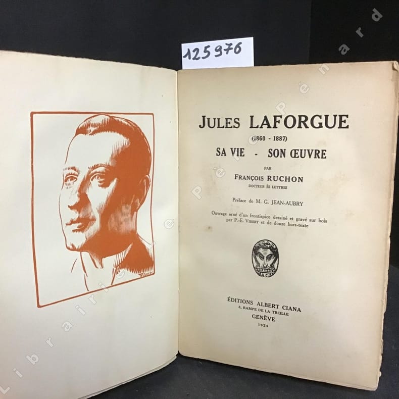 Genève, Albert Ciana, 1924, gr. in-8°, 283 p., partiellement non coupé + 1 frontispice de Laforgue par Vibert et 12 hors-textes, avec un envoi ms. de l'auteur à M. de Weck, brochure originale, tachs d’eau, usé.