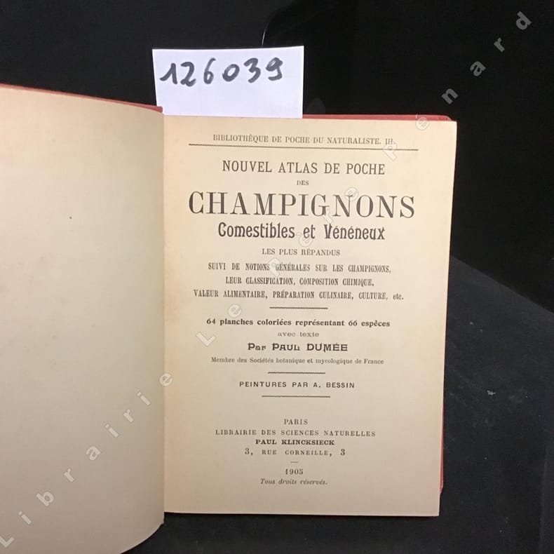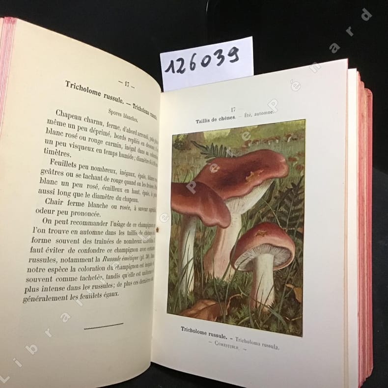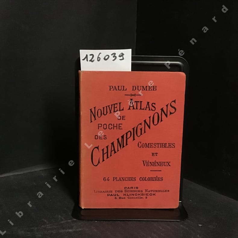 Paul Klincksieck. 1905. In-12. Cartonnage d'éditeurs. Etat passable, Coins frottés, Dos fané, Papier jauni. 145+32 pages. Tranches rosées. Rousseurs. Tampon en page de titre. 64 planches colorées représentant 66 espèces.. . . . Classification Dewey : 635.8-Champignons