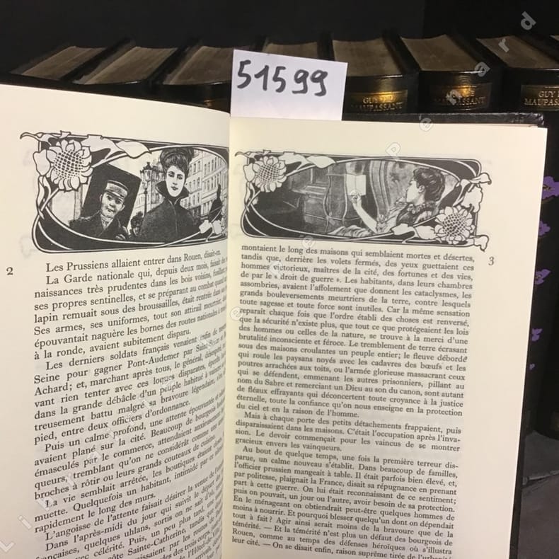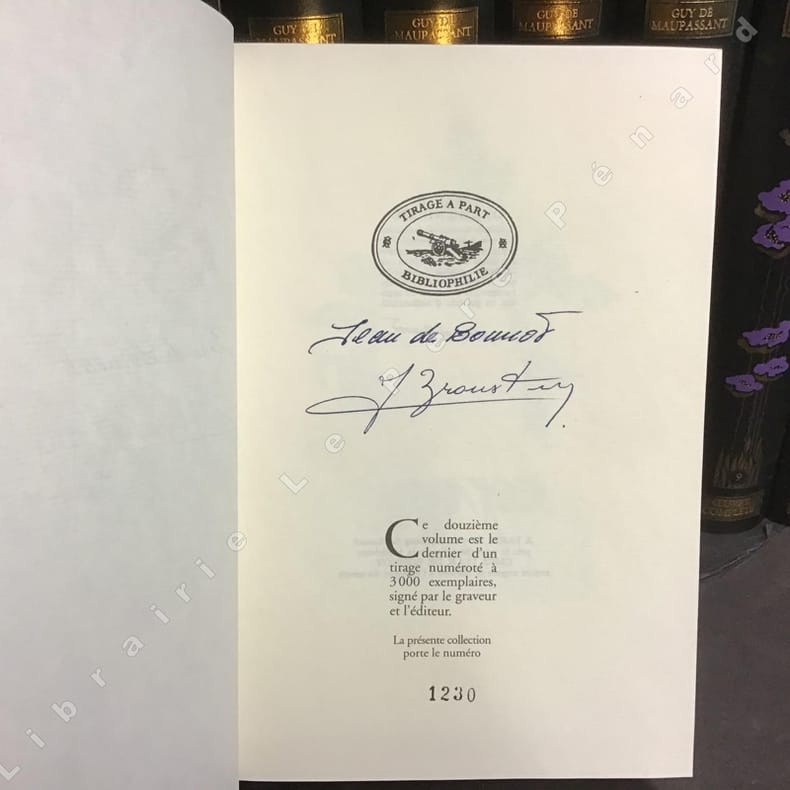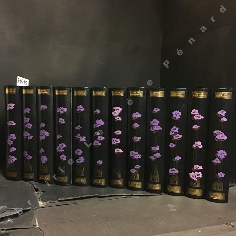 Paris Jean de Bonnot 1992 12 volumes in-8° (210x140mm). Reliures en pleine peau noire, dos et plats ornés de décor floral, têtes dorées, gardes décorées, signet (reliure éditeur). Portrait-frontispice de Maupassant sur chaque volume. Exemplaire du tirage de tête, limité à 3000 exemplaires (n° 2214). L'oeuvre complète rassemble : Boule de Suif ; Mademoiselle Fifi ; Une Vie ; Bel-Ami ; Mont-Oriol ; Pierre et Jean ; La maison Tellier ; Clair de lune ; Les Soeurs Rondolf ; Monsieur Parent ; La Petite Roque ; Le Horla ; Le Rosier de Madame Husson ; La Main gauche ; Contes divers ; Chroniques inédites. Très bel ensemble. Poids important (10 kg), merci de prévoir des frais de port supplémentaires.