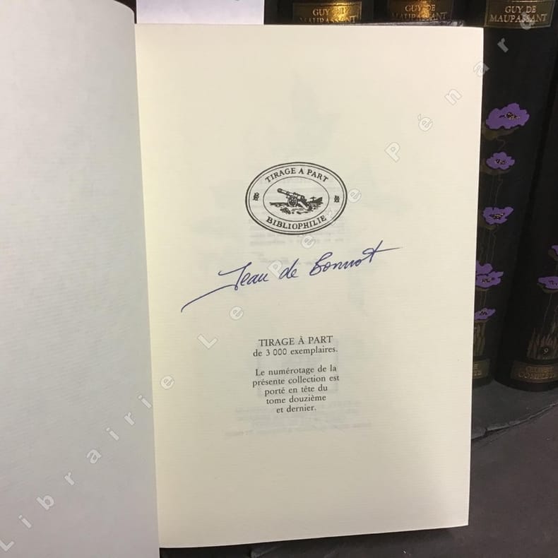 Jean de Bonnot 1980 Jean de Bonnot, 12 volumes, 1980, reliure éditeur noire avec décor à froid sur les plats et ornements motifs dorés sur les dos, tranches supérieures dorée, environ 21x14 cm, édition numérotée 156/1020 sur le dernier volume. Des frottements sur les coins et les coupes, une épidermure sur un plat et une petite fente sur une coiffe, coins supérieurs d'un volume émoussés. Bon état pour le reste et intérieurs bien propres.