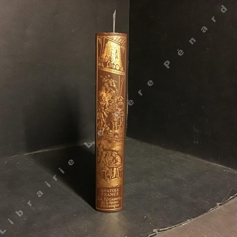 Jacques Ménétrier, dit Jacques Tournebroche à cause de la profession à laquelle l'a voué son rôtisseur de père, tient une librairie quand il entreprend de raconter ses aventures de jeunesse au XVIIIème siècle.C'est un roman picaresque plein de bouleversements, tragiques ou burlesques, au terme desquels un jeune homme, naguère ingénu, se trouve avoir fait son éducation morale. Mais La Rôtisserie de la reine Pédauque, tout en respectant les lois du genre, va plus loin et pose des questions essentielles sur le sens de la vie : les discussions philosophiques donnent au livre sa valeur d'inquiétude et d'apologie du désir. Ecrit en 1893, notre édition de 1925 revue et corrigée par l'auteur est établie dans une fine reliure en demi-chagrin brun sombre à coins, dos à quatre nerfs avec pavé titre et auteur en cuir brun clair, en bon état (légère insolation du dos, légers frottements en coins, aux coiffes et aux mors et qqes taches de décoloration). intérieur bien propre (pages légèrement jaunies).
