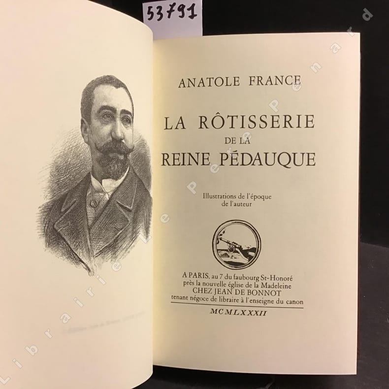 Imposant succès de l'auteur, La Rotisserie de la Reine Pédauque « la plus significative de ses oeuvres» est aussi celle de la maturité. À l'été, 1892, France, qui passe l'été avec sa fille Suzanne à Saint-Thomas, petite village de l'Aisne, termine cet imposant roman de plus de 600 pages. Le 10 août écri-il à un ami que sa reine Pédauque est «arrivé au 496° feuillet [...]. Le romancier a apporté son manuscrit dans sa valise ». En septembre, La Rotisserie est achevée et dès le 6 octobre elle commence à paraître en feuilletons dans L'Échos de Paris. Les origines du plus célèbre des romans de France puise allègrement dans les oeuvres les plus singulières du XVIIIe siècle, époque qui eût toujours sa préférence. Le personnage de l'abbé Coignard, le rôtisseur de la rue Saint-Jacques, maître Léonard et d'autres encore tout aussi savoureux ornent cette oeuvre qui inquiéta son auteur jusqu'à sa première publication. Le 5 octobre 1892, pris d'un doute affreux alors que L'Échos en publie les première pages, il écrit à sa confidente Madame de Caillavet «La Rôtisserie est toute à refaire. Je suis accablé...» Le 22 mars 1893 le texte paraît en volume chez Calmann Lévy. L'on sait la suite et son succès. Peu de titres dans la littérature de la fin du XIXe on connût un tel engouement, y compris bibliophilique. Outre les retirages nombreux et les éditions illustrées, les collectionneurs donnèrent aux plus grands ateliers cette Rotisserie qui fut admirablement et précieusement reliée. L'éditeur fit imprimée 20 japon et 40 hollande sous couverture orange - pour ne donner qu'un exemple citons celui de l'exemplaire du Bourg de Bozas sur japon relié par Meunier, assez dans le goût de l'époque. Il est amusant de noter enfin, que le libraire Conquet, avisé et prudent, à la suite de cet impressionnant succès, souscrivit auprès de l'éditeur à tous les futurs grands papiers des oeuvres de France. Le billet conservé dans cet exemplaire est adressé au poète algérianiste Albert Tustes (1888-1943). Il est l'auteur des Sirénéennes lauréat du grand Prix de l'Algérie en 1927.