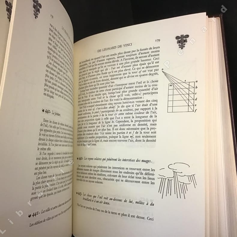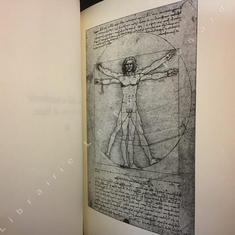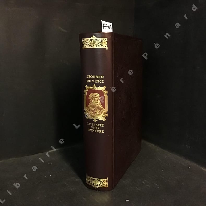 1977 Chez Jean de Bonnot, tenant négoce de libraire à l'enseigne du canon - 1977 - Tirage de tête - In-4, reliure plein cuir aubergine de l'éditeur avec riche décors à froid sur les plats (médaillon central représentant une femme nue accompagnée d'un ange) et dos richement orné du titre, de l'auteur et du portrait en doré de Léonard de Vinci, tranche de tête dorée, signet rouge - 387 pages + 42 planches + appendice + tables