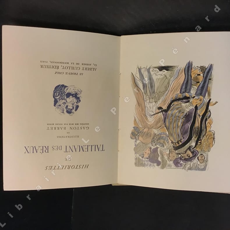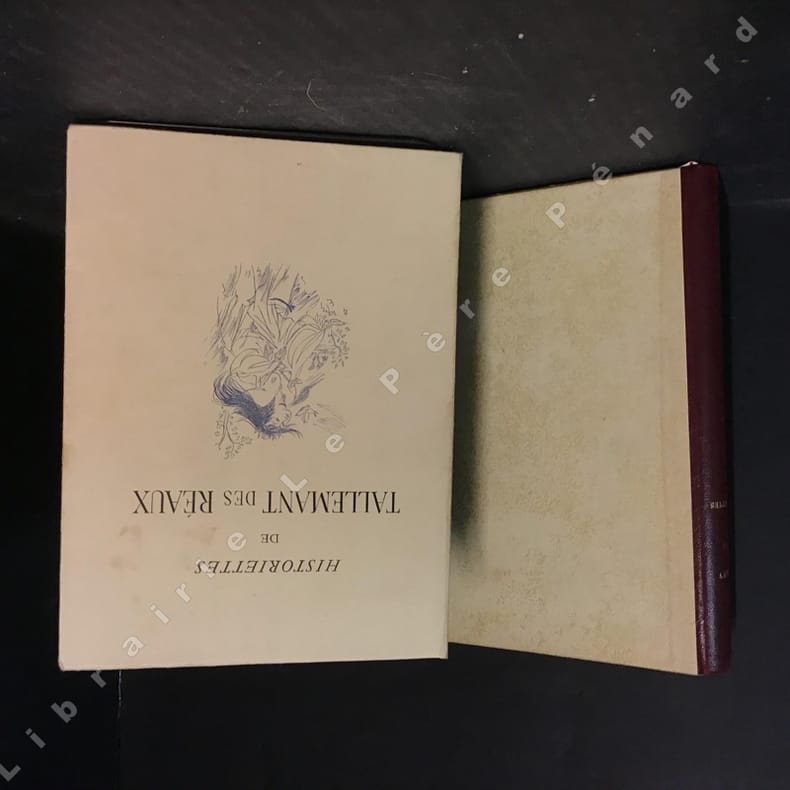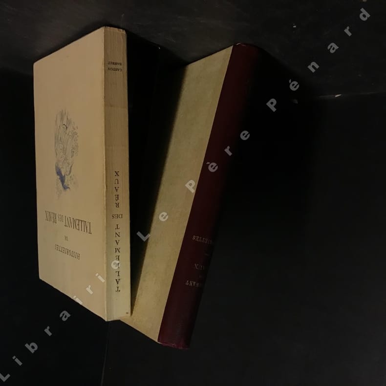 Illustrations de Gaston Barret gravées sur bois par Roger Boyer. 25 chroniques prises parmi les plus de 200 écrites par Tallemant des Réaux au XVIIème siècle sur la vie des personnalités, grandes et petites de son temps. Edition de 1952, un des 1825 exemplaire numérotés (n°389) imprimé sur vélin du Marais, broché, couverture rempliée, sous emboîtage éditeur à dos plat en cuir ˮlie de vinˮ avec titre et auteur or. Dans la collection ˮLe XVIIe siècle galantˮ de chez Albert Guillot Éditeur.