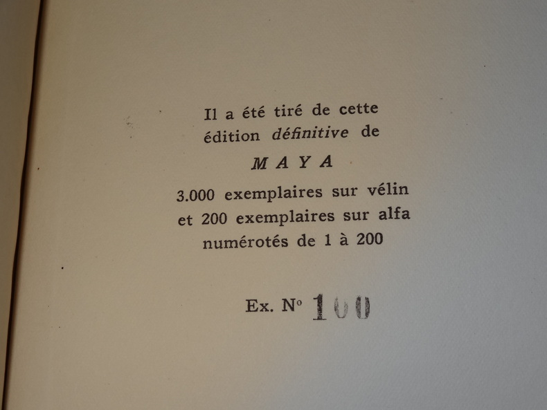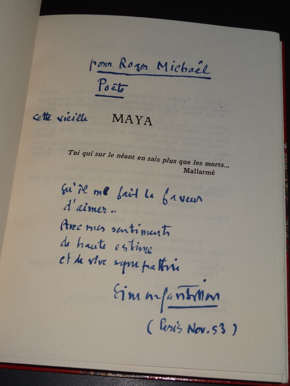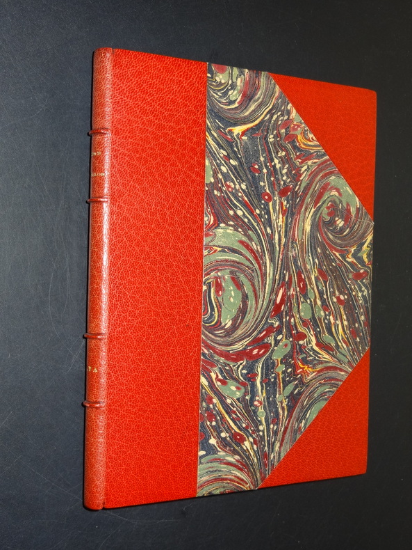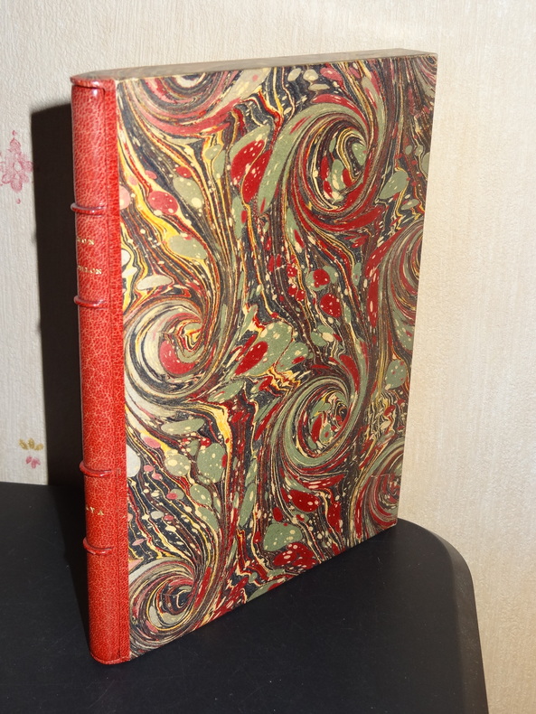 Audin éditeur, édition définitive, tirage à 3200 exemplaires numérotés, ici l'un des 200 sur alfa (n°100), 1 volume de format 19 x 14,5 cm, reliure demi maroquin à coins, tête dorée, couverture et dos conservés, étui carton gansé, 130 pages, envoi manuscrit de l'Auteur au poète Roger Michaël, très bon état.