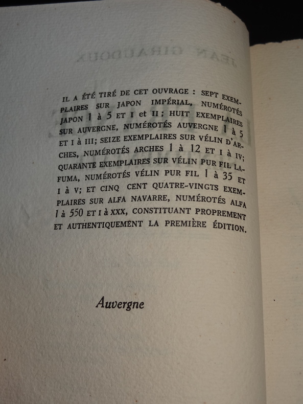 Editions Bernard Grasset, tirage de tête limité à 651 exemplaires, ici l'un des 8 sur Auvergne, non numéroté, 1 volume broché de format 19 x 14 cm, grandes marges, 288 pages, quelques rares rousseurs, bon état.