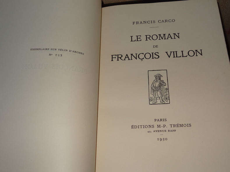M.-P. Trémois 1930 In-8 pleine basane blonde marbrée, dos à nerfs, dentelles, pièces de titre, couvertures et dos conservés, 238 pp. 65 illustrations d'après des documents de la Bibliothéque nationale bois gravés du XVème siècle pour les premières oeuvres de Villon. Bel exemplaire.