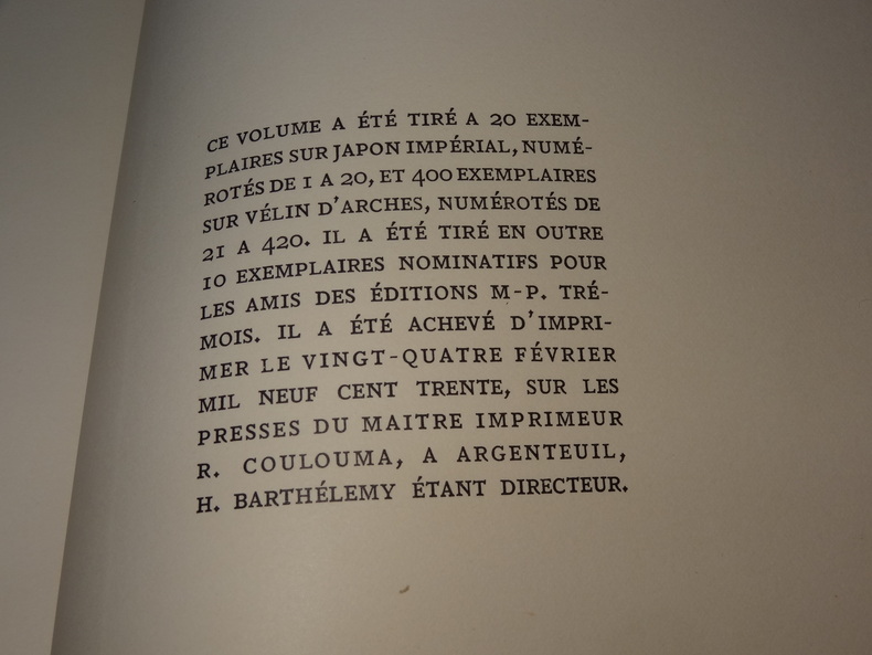 Editions M.-P. Trémois, tirage limité à 430 exemplaires, ici l'un des 400 sur vélin d'Arches (n°243), 1 volume de format 28,5 x 20 cm, reliure demi basane, tête dorée, couverture et dos conservés, 243 pages, gravures in et hors-texte, très bon état.