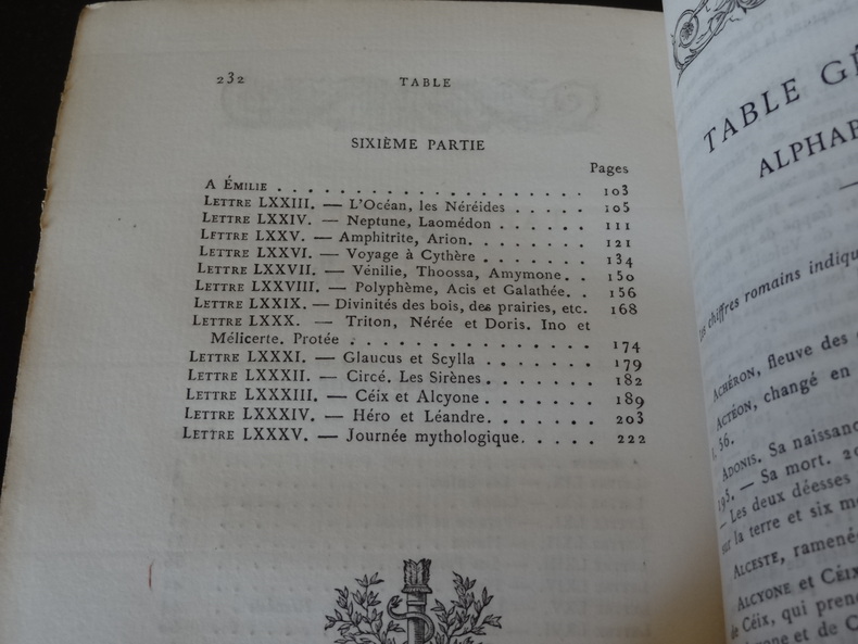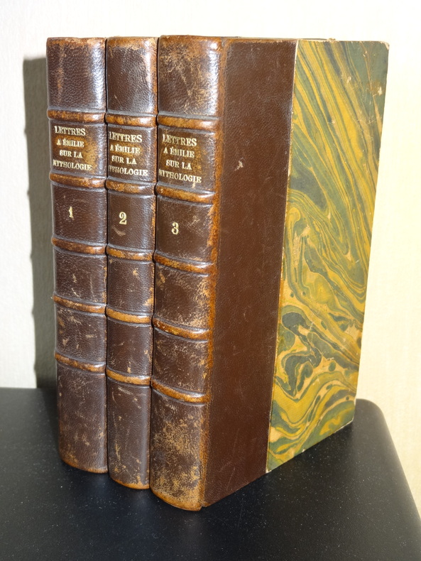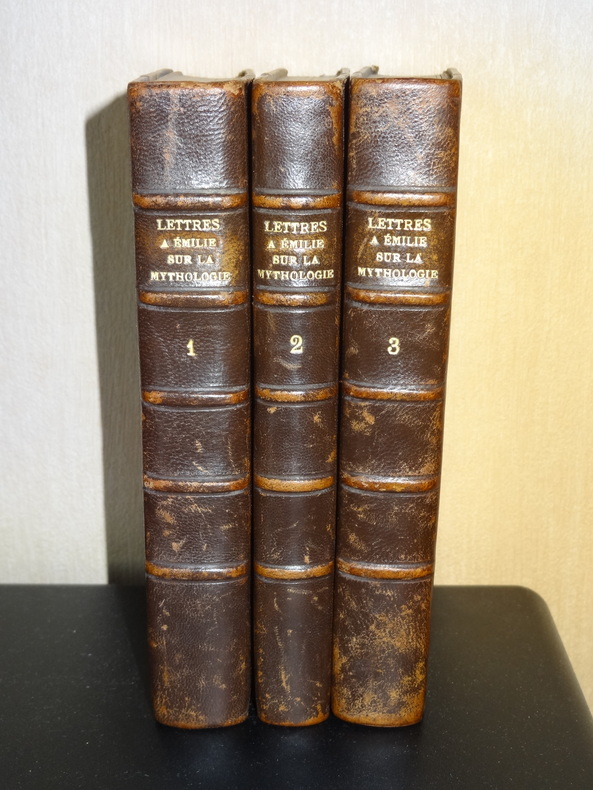 Demoustier. Lettres à Emilie sur la Mythologie édition ornée de 62 gravures en taille douce. Complet 6 tomes, reliés pleine basane époque, frottements, 15x10, bon état intérieur, 114+120+96+102+114+144pp. Paris, Nicolle, Dabot, Corbet, 1816 «Charles-Albert Demoustier, né le 13 mars 1760 à Villers-Cotterêts et mort le 2 mars 1801 à Paris, est un écrivain et dramaturge français. Les Lettres à Émilie sur la mythologie, écrit en prose et en vers, est constitué de leçons en forme de lettres adressées par un narrateur à sa jeune élève en vacances dont le modèle était sans doute la fameuse Marie-Guillemine Benoist, dont le salon de l'hôtel de Vougy, duquel Demoustier fut l'hôte assidu, était le rendez-vous de tout ce que Paris conservait de causeurs spirituels. Si l'ouvrage était déjà passé de mode à la fin du XIXe siècle où Julien Travers juge son « style faux, maniéré et prétentieux», il obtint le plus vif succès en son temps, et fit presque école. L'ouvrage est en effet semé de traits d'esprit, de saillies et de madrigaux, qui en font une extraordinaire satire de la société du temps» ref/25/8