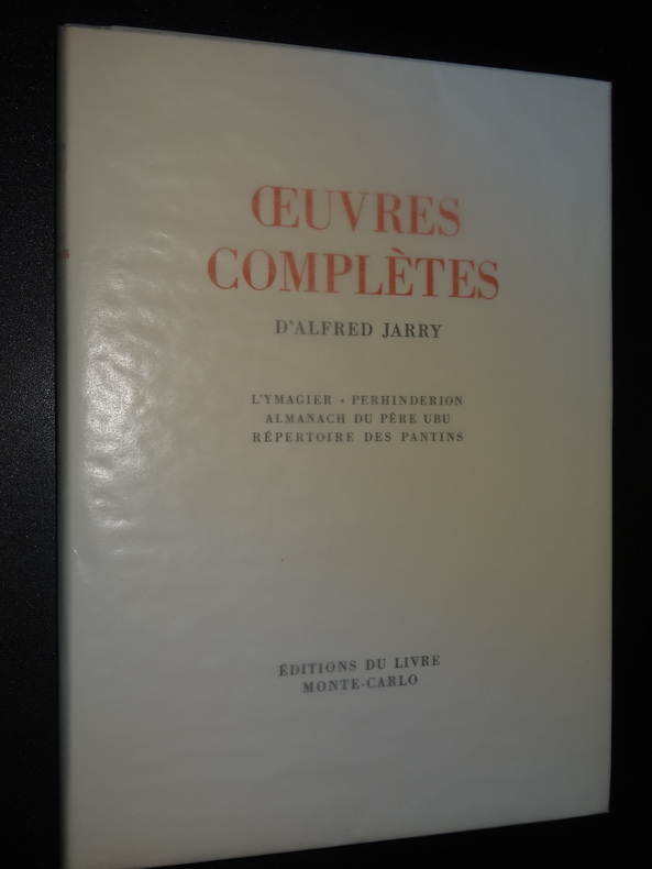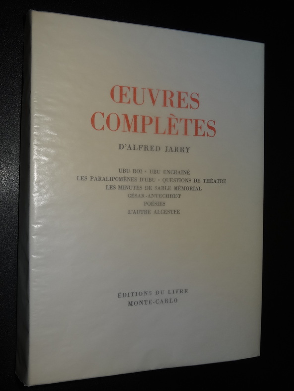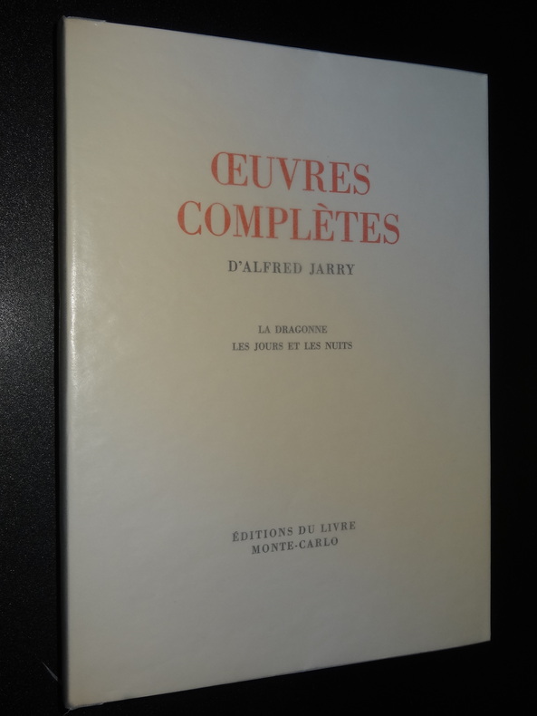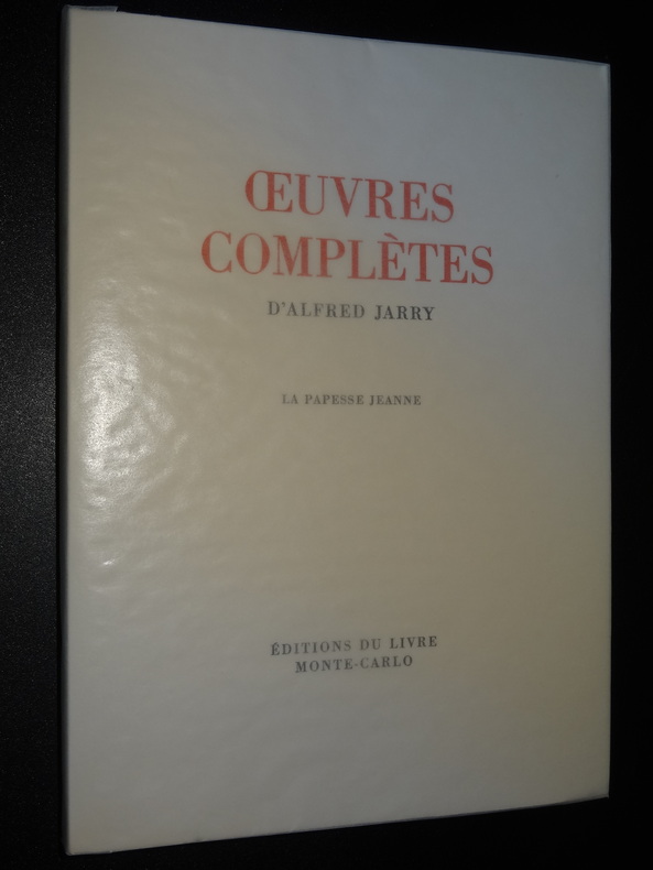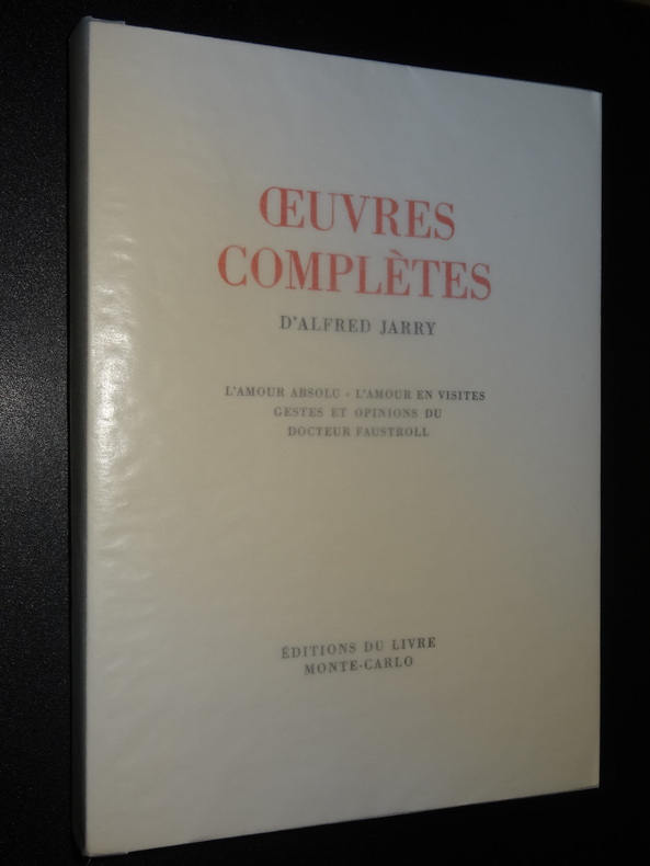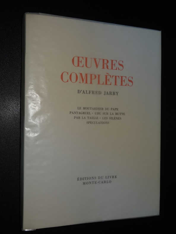 Monte-Carlo; Éditions du Livre, tirage à 3150 exemplaires, ici exemplaires n°941/3000 sur vélin sans bois, 8 volumes brochés de format 23 x 16,5 cm, couvertures à rabats, couverts sous papier cristal, 2 étuis carton. Tome 1 : L'Amour absolu - L'Amour en visites - Gestes et opinions du Docteur Faustroll, 323 pages. Tome 2 : La Papesse Jeanne, 203 pages. Tome 3 : Messaline - Le surmâle, 230 pages. Tome 4 : Ubu roi - Ubu enchaîné - Les paralipomènes d'Ubu - Questions de théâtre - Les minutes de sable mémorial - César-Antéchrist - Poésies - L'autre Alcestre, 429 pages. Tome 5 : La Dragonne - Les jours et les nuits, 299 pages. Tome 6 : Le moutardier du Pape - Pantagruel - Ubu sur la butte - Par la taille - Les Silènes - Spéculations, 395 pages. Tome 7 : Spéculations - Gestes - Critique - Correspondance - Souvenirs - Bibliographie, 349 pages. Tome 8 : L'Ymagier - Perhinderion - Almanach du Père Ubu - Répertoire des pantins, 155 pages, illustrations. Livres en très bon état, usures aux étuis, frais de port en supplément.