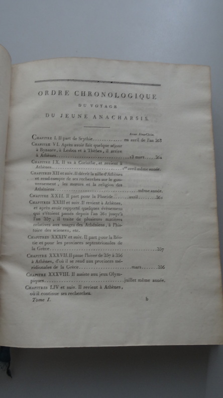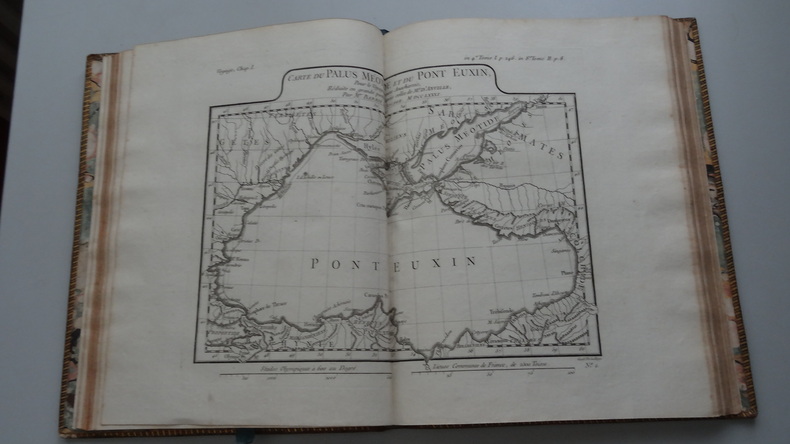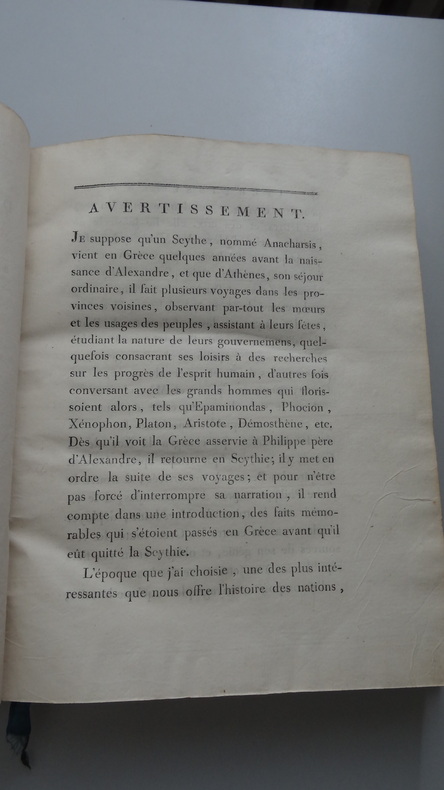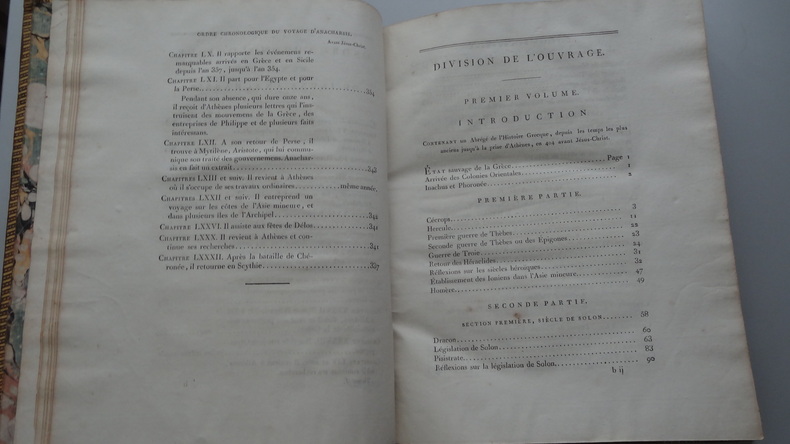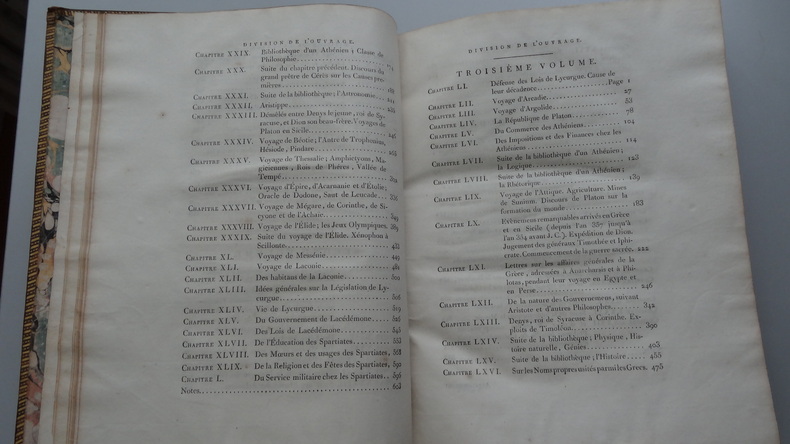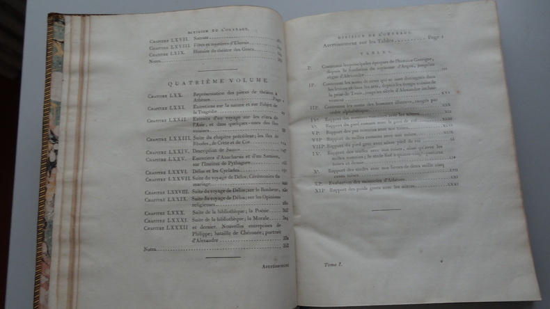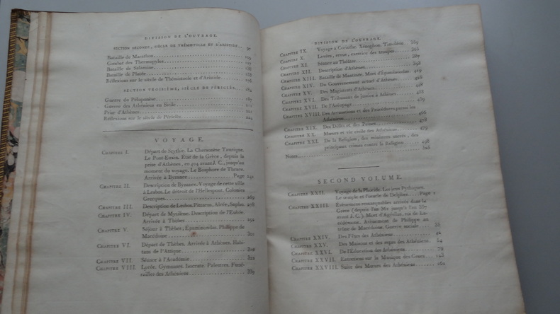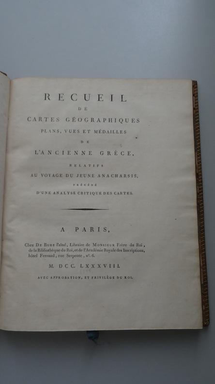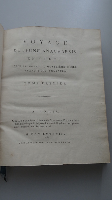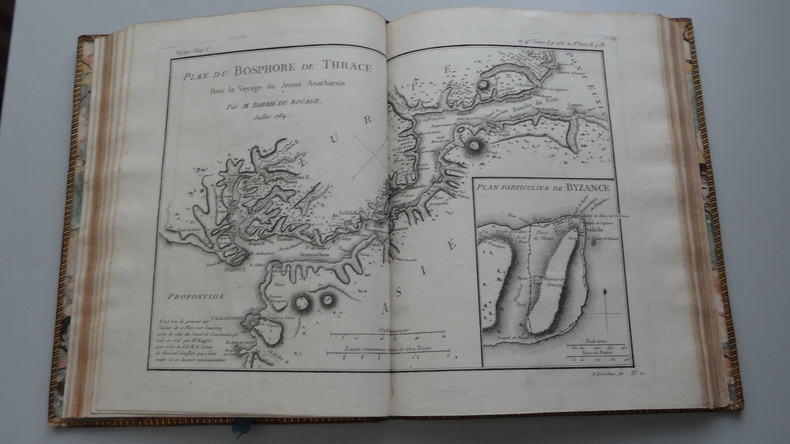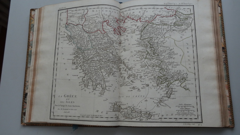 Chez De Bure l'aîné, Librairie De Monsieur Frère Du Roi 20 x 25,5 Paris Edition Originale 1788 Quatre volumes in-4, reliure plein veau raciné de l'époque, dos à cinq nerfs ornés de fleurons dorés, pièces de titre de maroquin rouge, pièces de tomaison de cuir vert, titre et tomaison dorés, plats encadrés de minces filets à froid, filets dorés sur les coupes, tranches marbrées, signets de soie vieux rose, [1] f. bl., VII-{1] pp. (faux titre, titre, avertissement), [2] pp. (Ordre chronologique du voyage), [8] pp. (Division de l'ouvrage), XLII pp. (Recueil de cartes géographiques, plans...relatif au voyage..., Analyse critique des cartes de l'ancienne Grèce dressées pour le voyage...), 553-[5], |8]-646-[4], [8]-599-[5], [8]-383-[1]-CLXXXIV-[6] pp. 31 gravures dépliantes pour la plupart (cartes, aux contours de couleurs, plans, vues, et une planche de monnaies) reliées sur onglets dans le texte (14 dans le premier vol., 11 dans le deuxième, 3 dans le troisième et 3 dans le quatrième). A noter 12 tables (noms, mesures antiques, monnaies...), un index des auteurs cités et une table générale des matières par ordre alphabétique, se trouvent à la fin du quatrième volume. Edition originale sur grand papier. "Le voyage d'Anacharsis", roman archéologique et voyage imaginaire d'un jeune Scythe dans la Grèce du IVe siècle avant Jésus-Christ, connut un immense succès de librairie. Publié dans un format in-8 plus populaire dès 1788 et réédité à de multiples reprises tout au long du XIXe siècle, y compris sous une forme abrégée à des fins scolaires, il contribua, par son didactisme, à diffuser auprès d'un large lectorat la connaissance de l'Antiquité grecque. Bonne et agréable reliure, mors fendu au plat supérieur du tome I sur deux cm, une galerie de vers en queue du tome II, accrocs aux coiffes du tome IV avec mors fendu sur trois cm, quatre coins émoussés, quelques légers accrocs sur les coupes, marques d'humidité aux marges extérieures des premières et dernières pages des volumes pouvant fragiliser le bord de certaines pages, bordure de la "Vue de Delphes" en partie décollée. Hormis ces quelques défauts, intérieur frais, cartes et plans en très bon état, bon exemplaire.(VerB82) PHOTOS NUMERIQUES DISPONIBLES PAR EMAIL SUR SIMPLE DEMANDE-DIGITAL PHOTOGRAPS MAY BE AVAILABLE ON REQUEST
