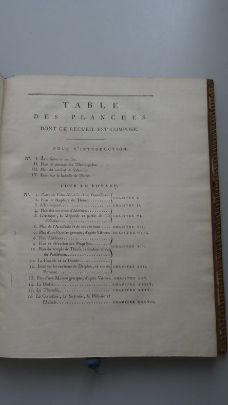 QUATRIÈME ÉDITION, la dernière revue et augmentée par l'auteur, la plus complète et l'une des plus belles de ce récit de voyage imaginaire servant de prétexte à une excellente histoire de la Grèce antique. Elle a été réalisée sur les presses de DIDOT jeune. UN DES CINQUANTE EXEMPLAIRES NUMÉROTÉS ET IMPRIMÉS SUR PAPIER VERGÉ DE HOLLANDE (n°31), seul tirage de luxe. L'atlas contient 36 PLANCHES de cartes et vues gravées sur cuivre, les délimitations de 9 cartes ayant été coloriées. Ce tirage de luxe est enrichi dans l'atlas de DEUX PORTRAITS de l'abbé Barthélemy : un en frontispice par Langlois d'après le buste d'Houdon et l'autre dans une planche hors-texte au format grand in-octavo insérée avant le feuillet d'explication des médailles dessiné et gravé par A. Saint-Aubin d'après la médaille de Duvivier. L'atlas comporte également 50 pages d'analyse critique des cartes de J. D. Barbié du Bocage, deux pages d'une note relative à la planche représentant les deux frontons du Parthénon, quatre pages d'une pièce en vers adressée par Fontanes à l'abbé Barthélemy et une page de description des médailles. La table annonce 40 planches numérotées, mais la "Carte générale de la Grèce avec ses colonies", qui forme le n°1 de l'atlas, n'a été publiée qu'en 1811, et manque conséquemment aux exemplaires reliés avant cette date. Notre exemplaire a également été relié sans la planche n°2 intitulée "Carte particulière de la Grèce et de ses Iles", et les planches 30 et 31 qui représentent respectivement la "Carte de la Messénie" et la "Carte de la Laconie et de l'île de Cythère". Le premier volume de texte contient en frontispice un PORTRAIT de Barthélemy dessiné d'après nature et gravé par Aug. Saint Aubin. Jean-Jacques BARTHÉLÉMY (1716-1795), savant littérateur de l'Académie française, archéologue et numismate, mit près de trente années à préparer son ouvrage à la prodigieuse érudition sur l'ancienne civilisation grecque. Cet ouvrage, publié une première fois en 1788, lui fut inspiré par un voyage qu'il fit en Italie en 1755, au cours duquel les souvenirs de l'antiquité classique, ravivée par le vif intérêt archéologique des fouilles de Pompéï, s'imposèrent à son esprit jusqu'à faire revivre pour lui en une résurrection idéale ce monde lointain. Le succès du "Voyage du jeune Anacharsis", véritable somme des connaissances du XVIIIe siècle sur la Grèce antique, contribua à développer le goût de l'Antique en France et en Europe et à diffuser le goût néoclassique. Gérard Oberlé souligne dans sa notice de la "Bibliothèque bachique" que cet ouvrage contient notamment de nombreuses informations très précieuses concernant les moeurs et la vie civile des athéniens, les fêtes, les grandes Dionysiaques, le culte de Bacchus, les repas, les moeurs de table, les plats, les boissons, de longues listes de nourritures avec leurs provenances, les cuisiniers, les recettes, des informations sur divers vins de Grèce et des îles, les fêtes des Spartiates, les fêtes et mystères d'Eleusis, l'agriculture, etc. (Brunet, I, 674 - Oberlé, "Une Bibliothèque bachique", 10 - Laffont-Bompiani, "Dictionnaire des oeuvres", IV, 720 - Fléty, 162). SPLENDIDE EXEMPLAIRE en grand papier, au corps d'ouvrage sans rousseurs, dans une reliure uniforme en maroquin décorée de René Simier, dit «Simier Père », qui fut «relieur du roi » sous la Restauration, CONDITION RARE. NICE COPY. PICTURES AND MORE DETAILS ON REQUEST.