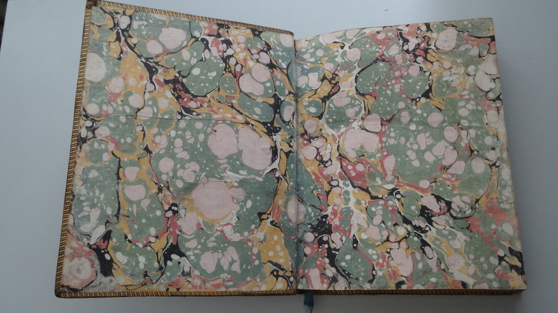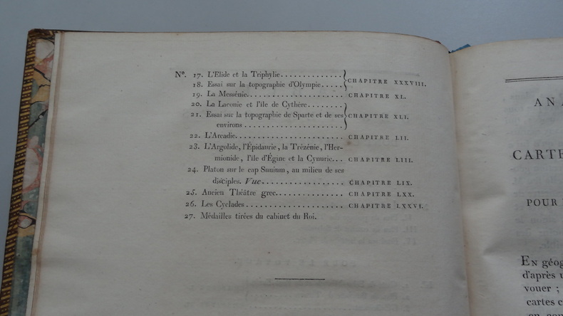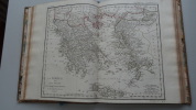 Chez De Bure l'aîné 13 x 20,5 Paris 1791 7 volumes in-8, reliure plein veau marbré de l'époque, dos lisses ornés de motifs floraux dorés, d'une rosace et d'une lyre dorées, pièces de titre de maroquin rouge, pièces de tomaison de cuir vert, titre et tomaison dorés, tranches jaunes, [4]-XX-286, [6]-415, [6]-401, [6]-411, [6]-399, [6]-366-[1], [6]-96-CCVI-[1, bl.] pp. Troisième édition que nous accompagnons du "Recueil de cartes géographiques, plans, vues et médailles de l'ancienne Grèce, relatif au voyage du jeune Anacharsis précédé d'une analyse critique des cartes par Barbié du Bocage", Paris, Garnery libraire, 1819, reliure demi-basane de l'époque, dos muet, et plats de cartonnage noir, XIX pp., 32 cartes, plans, vues et médailles dépliants (soit 31 pl. annoncées au sommaire + une carte dépliante intitulée "Ancien continent pour l'intelligence du voyage du jeune Anacharsis)". A noter à la fin du vol. 7 se trouvent les différentes tables (noms, mesures antiques, monnaies...), un index des auteurs cités et une table générale des matières par ordre alphabétique. "Le voyage d'Anacharsis", roman archéologique et voyage imaginaire d'un jeune Scythe dans la Grèce du IVe siècle avant Jésus-Christ, connut un immense succès de librairie. L'édition originale in-4 publiée en 1788 a été suivie la même année par une édition dans un format in-8 plus populaire et rééditée à de multiples reprises tout au long du XIXe siècle, y compris sous une forme abrégée à des fins scolaires. Il contribua, par son didactisme, à diffuser auprès d'un large lectorat la connaissance de l'Antiquité grecque. Agréable et bonne reliure pour les sept volumes, rousseurs encadrant les contre plats intérieur frais. Reliure modeste et usagée du "Recueil des cartes et plans", cartes en bon état avec rousseurs éparses, notamment aux marges, Bon exemplaire. Ex-libris manuscrit sur la première garde blanche. PHOTOS NUMERIQUES DISPONIBLES PAR EMAIL SUR SIMPLE DEMANDE-DIGITAL PHOTOGRAPS MAY BE AVAILABLE ON REQUEST