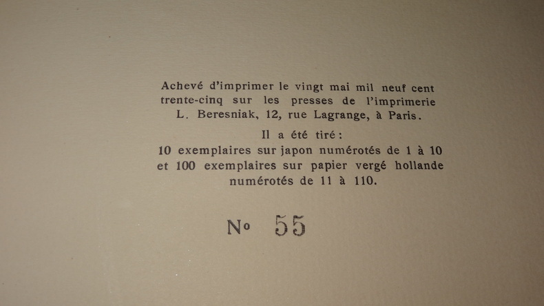 Galerie "Gravitations" Paris 1935 Plaquette in-8 oblong "à l'italienne" de 14 pages ( non paginé ), brochée sous couverture rempliée. Dessin hors-texte de Pierre INO. Edition originale, 1 des 100 exemplaires numérotés sur Hollande ( N°14 ). Très bel exemplaire.