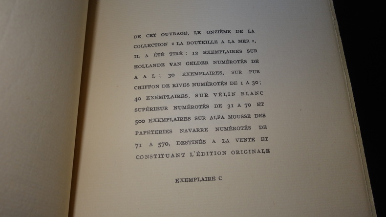 Editions du Sablier, collection de "La Bouteille à la Mer", tirage à 582 exemplaires, l'un des 12 exemplaires sur Hollande Van Gelder (n°c) , 1 volume broché de format 19 x 14 cm, 77 pages, envoi manuscrit de l'Auteur, bon état, frais de port en supplément.