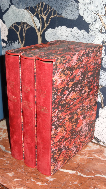 Éditions André Sauret, tirage à 4000 exemplaires numérotés, ici l'un des 3700 relié suédine (n°1499), 3 volumes de format 28 x 22 cm, étuis carton gansés, têtes dorés, 271 + 241 + 257 pages, illustrations en couleurs, petit choc au dos du tome 3, au niveau du titre, intérieur en très bon état. Frais de port en supplément.