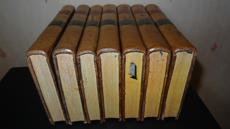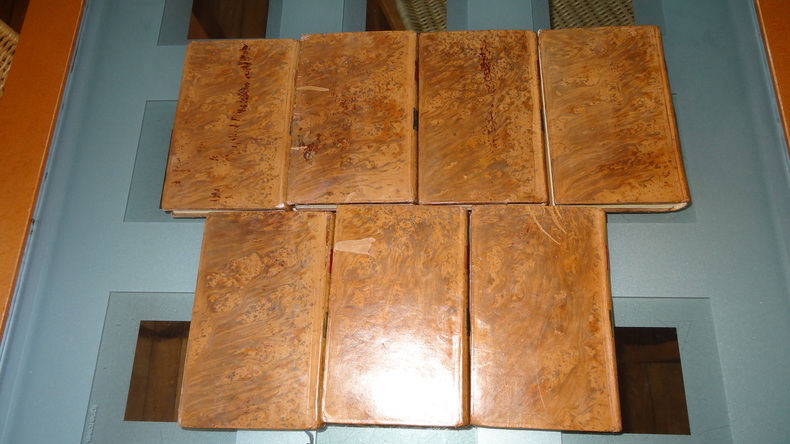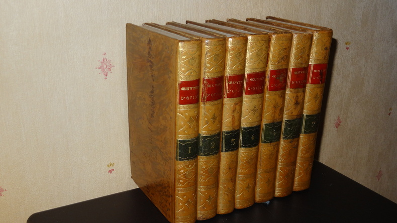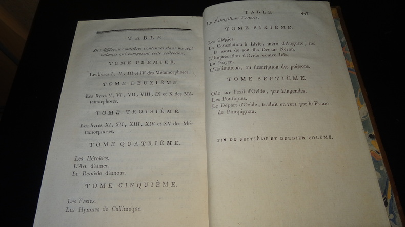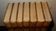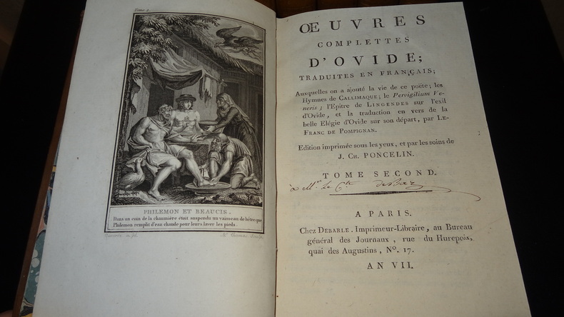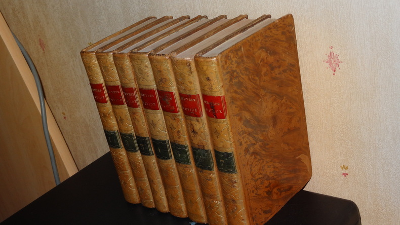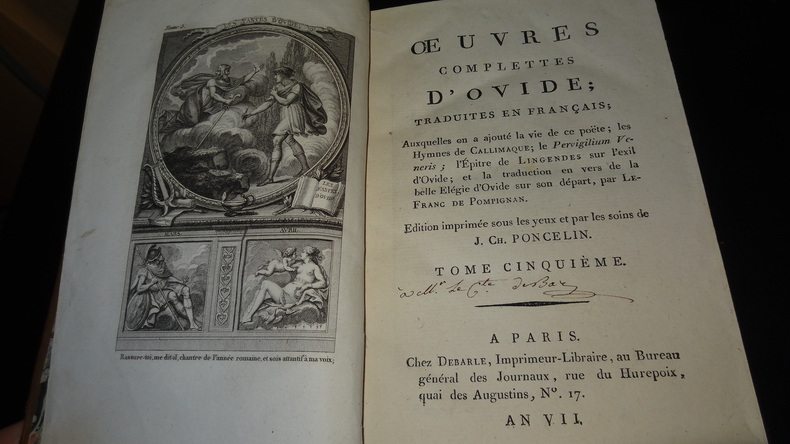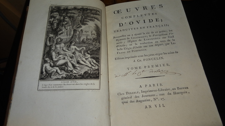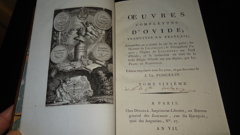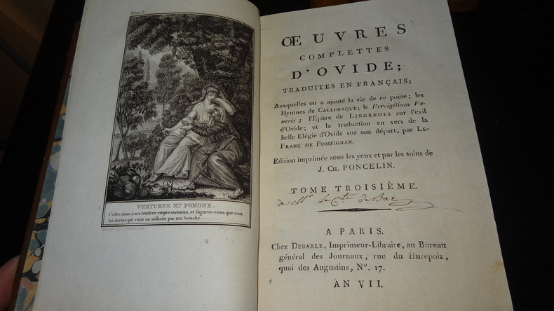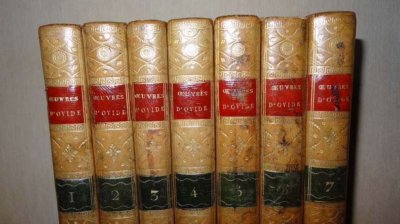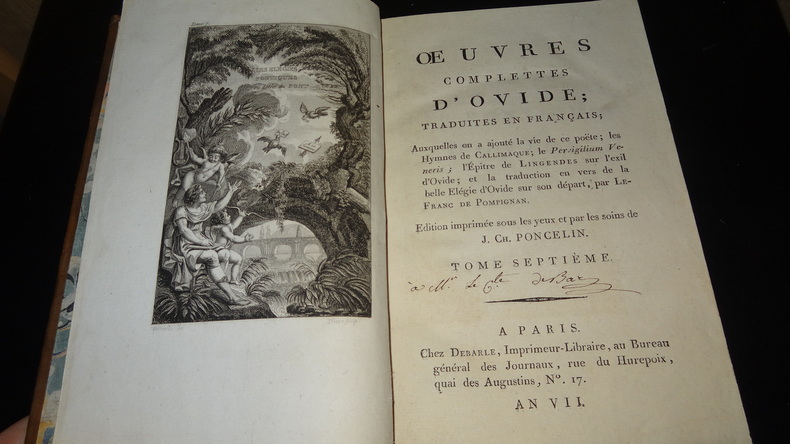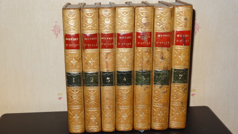 Auxquelles on a ajouté la vie de ce poëte; les Hymnes de Callimaque; le Pervigilium Veneris; l'Épitre de Lingendes sur l'exil d'Ovide; et la traduction en vers de la belle Élégie d'Ovide sur son départ, par Lefranc de Pompignan. Édition imprimée sous les yeux et par les soins de J. Ch. Poncelin. À Paris; chez Debarle, An VII. 7 volumes de format 20,5 x 13 cm, reliures plein veau d'époque, pièces de titres, tranches mouchetées, chaque volume contient une gravure en frontispice, CXXV, 290 + 436 + 392 + 504 + 500 + 496 + 447 pages, quelques taches au dos, quelques épidermures sur les plats, intérieurs en bel état, imprimés sur papier vergé, sans rousseurs. Frais de port en supplément.