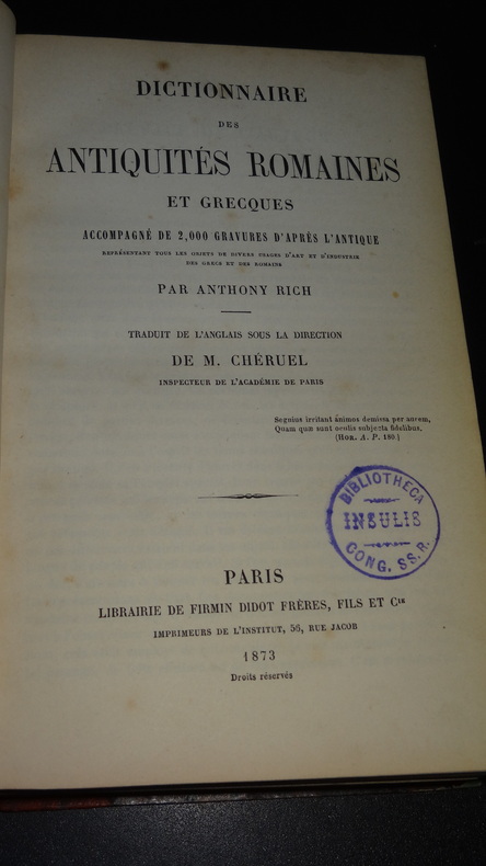 Paris, Firmin Didot, 1861. In-8 relié demi-maroquin (Weber. Rel.) , dos à nerfs, XII-740 p. Accompagné de 2000 gravures d'après l'Antique rprésentant tous les objets de divers usages d'art et d'industrie des Grecs et des Romains. Traduit de l'anglais sous la dir. de M. Chéruel. Préface de l'auteur. Bon état : dos légèrement fané, coiffes et mors légèrement frottés.