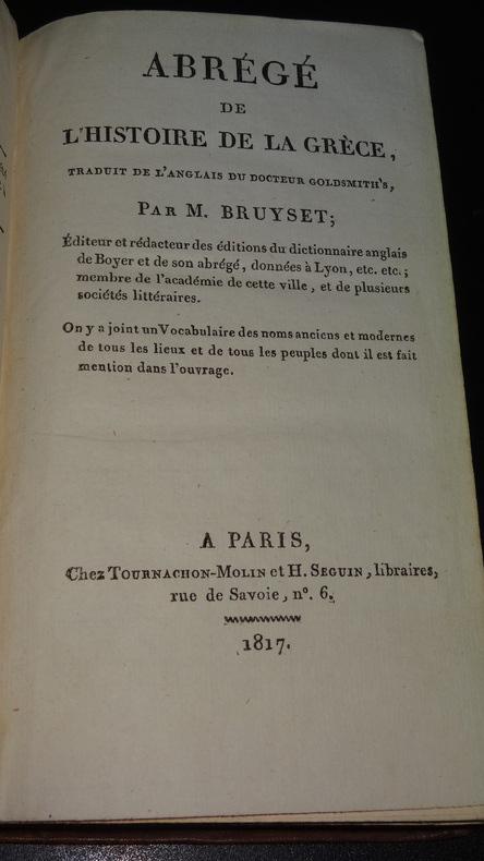 À Paris; Chez Tournachon-Molin et H. Seguin, libraires, traduction de M. Bruyset, 1 volume de format 17,5 x 10,5 cm, reliure plein veau d'époque, dos orné, VIII + 386 pages, petites usures, petit manque à la coiffe supérieure, bon état. Frais de port en supplément.