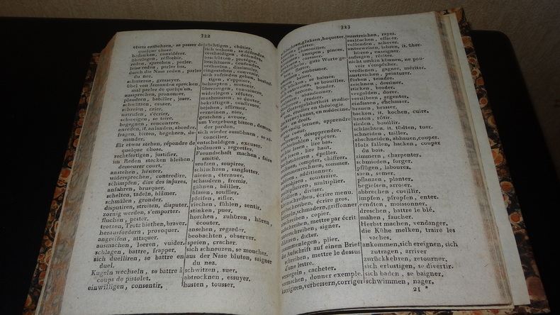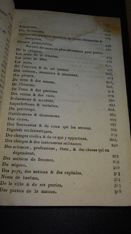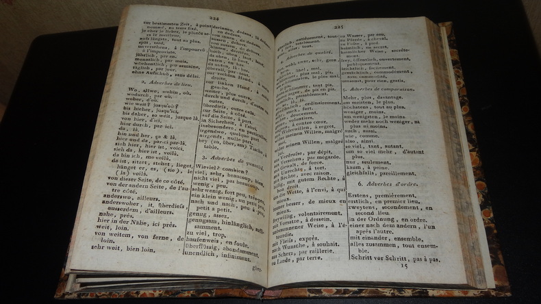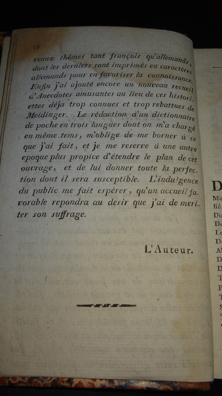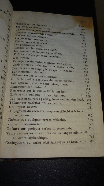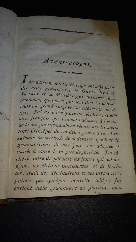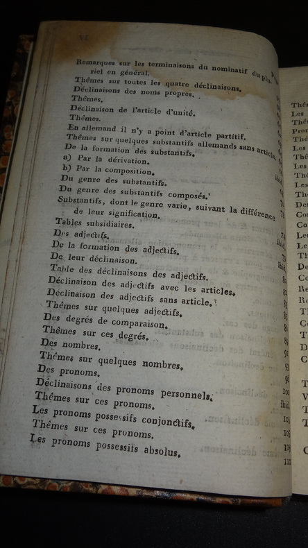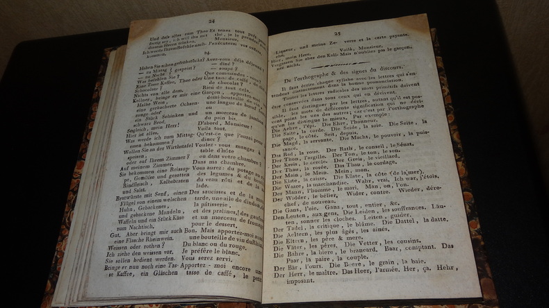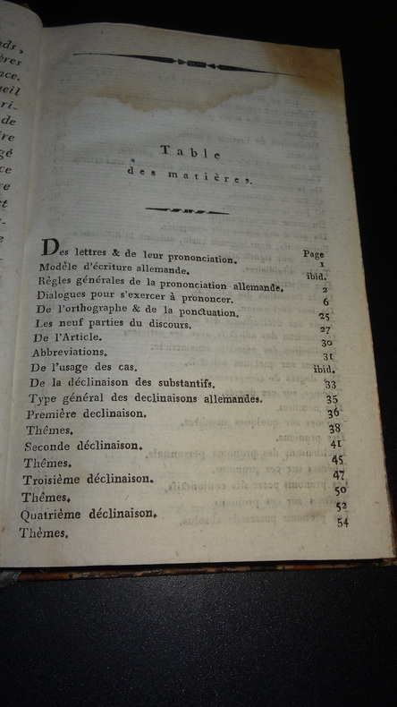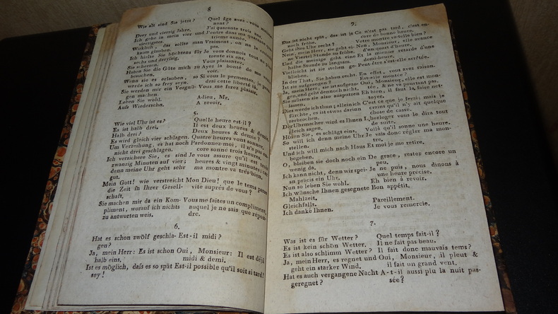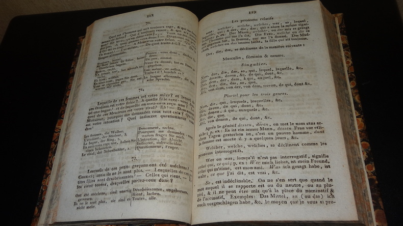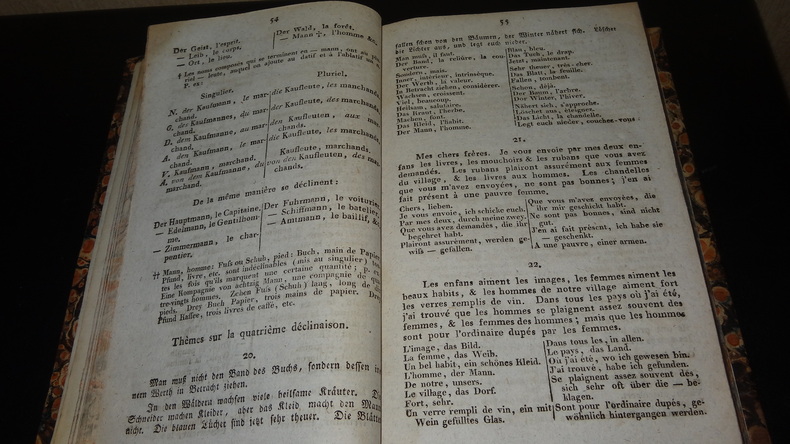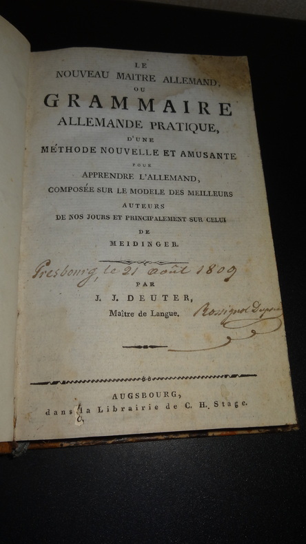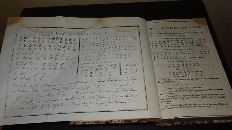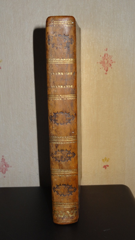 D'une méthode nouvelle et amusante pour apprendre l'allemand, composée sur le modèle des meilleurs auteurs de nos jours et principalement sur celui de Meidinger. À Augsbourg, dans la Librairie de C. H. Stage, sans date. 1 volume de format 19 x 12 cm, reliure demi veau, tranches marbrées, X + 1 tableau dépliant + 357 pages, reliure solide en bon état, une mouillure sur les hauts de pages affecte les pages I à X ainsi que le tableau, de plus les pages 1 à 54 sont affectées par une mouillure en angle (voir photos), sinon bon état. Frais de port en supplément.