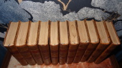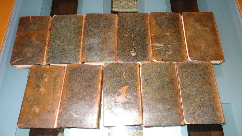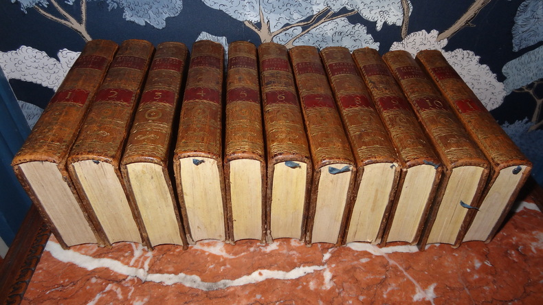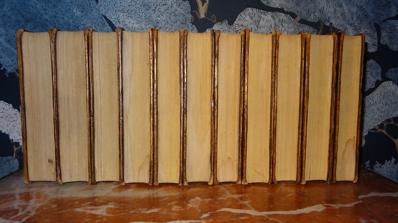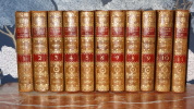 1801 Paris, Cussac, 1801-05. Vingt-cinq volumes in-8 (203 X 130 mm) basane fauve marbrée, encadrement de roulette dorée sur les plats, dos lisse cloisonné, compartiments entièrement ornés de croisillons et petits fleurons dorés, pièces de titre et de tomaison maroquin grenat et noir, coupes et coiffes ornées de roulettes dorées, tranches mouchetées en rouge (Reliure de l'époque). Manques à sept coiffes supérieures. Étiquette papier en pied de chaque volume.