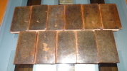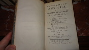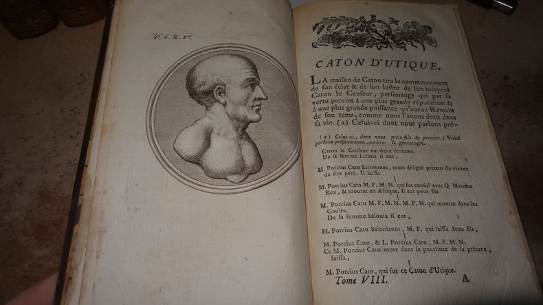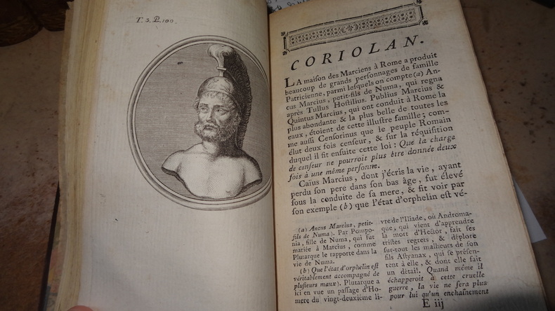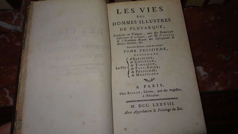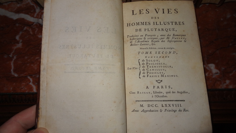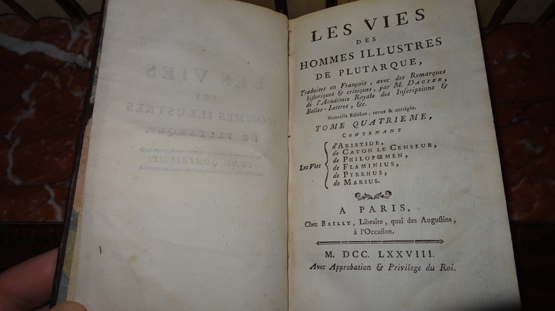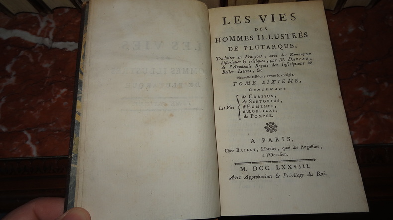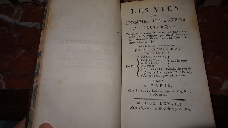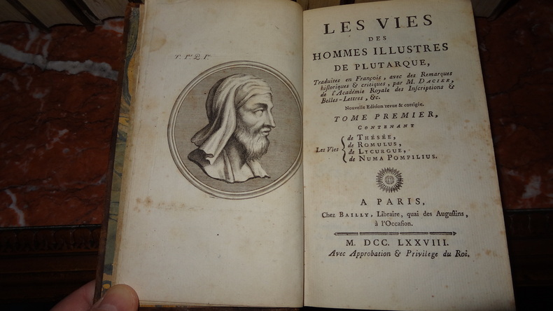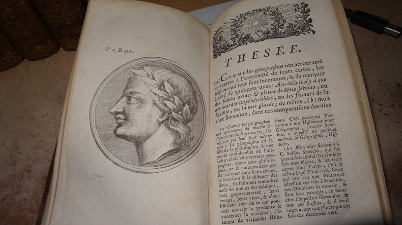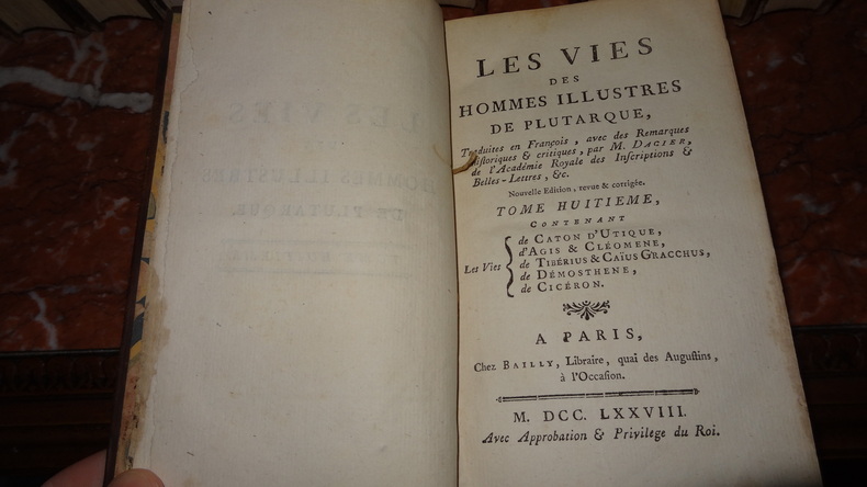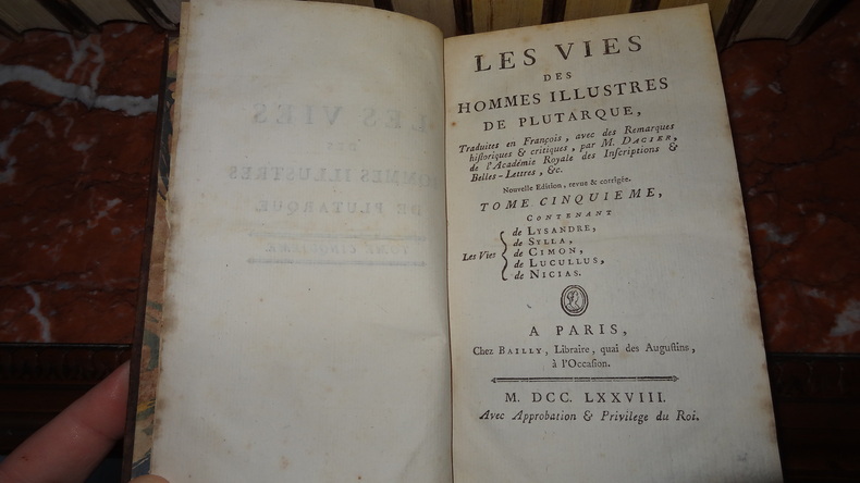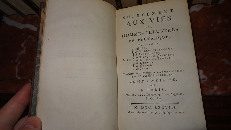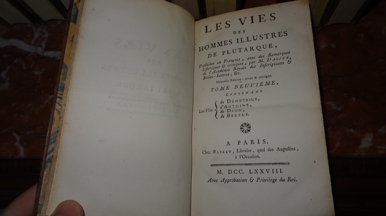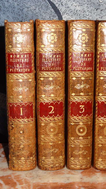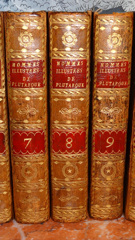 "Traduites en François, avec des remarques historiques & critiques, par M. Dacier, nouvelle édition revue et corrigée, À Paris, Chez Bailly, Libraire, quai des Augustins, à l'Occasion, M. DCC. LXXVIII." 11 volumes de format 17,5 x 10,5 cm, reliures plein veau d'époque. TOME 1 : Les vies de Thésée, Romulus, Lycurgue, Numa Pompilius, 1 portrait en frontispice, 480 pages, 4 portraits gravés hors-texte, coiffe supérieure usée, quelques épidermures sur les plats. TOME 2 : Les vies de Solon, Publicola, Thémistocle, Camillus, Périclès, Fabius Maximus, 516 pages, 4 portraits gravés hors-texte, légère usure aux angles. TOME 3 : Les vies d'Alcibiade, Coriolan, Timoléon, Paul-Émile, Pélopidas, Marcellus, 530 pages, 2 portraits gravés hors-texte, légères usures aux angles. TOME 4 : Les vies d'Aristide, de Caton le Censeur, Philopœmen, Flaminius, Pyrrhus, Marius, 497 pages, coiffe supérieure en partie usée, 1 pâle mouillure marginale affecte la presque totalité des pages. TOME 5 : Les vies de Lysandre, Sylla, Cimon, Lucullus, Nicias, 439 pages, 1 pâle auréole d'humidité affecte l'angle des pages 1 à 122. TOME 6 : Les vies de Crassus, Sertorius, Eumènes, Agésilas, Pompée, 495 pages, coiffe haute en partie usée, de pâles mouillures marginales affectent la presque totalité des pages. TOME 7 : Les vies d'Alexandre, César, Phocion, 428 pages, 3 portraits gravés hors-texte, de pâles mouillures marginales affectent la totalité des pages. TOME 8 : Les vies de Caton d'Utique, Agis & Cléomène, Tibérius & Caïus Gracchus, Démosthène, Cicéron, 520 pages, 3 portraits gravés, angles un peu frottés. TOME 9 : Les vies de Démétrius, Antoine, Dion, Brutus, 459 pages, 4 portraits gravés, épidermures sur les plats. TOME 10 : Les vies d'Artaxerce, d'Aratus, Galba, Othon, Aristippe (Traduit du grec de Diogène Laerce), Annibal (Par M. Dacier), II + 512 pages, 4 portraits gravés, angles un peu frottés. TOME 11 : Supplément aux vies des hommes illustres de Plutarque (Traduites de l'anglais de Thomas Rowe), X + 432 pages, 7 portraits gravés hors-texte, coiffe un peu usée, la quasi totalité des pages est affectée par une mouillure d'angle. Ensemble complet, collationné, en bon état général. Frais de port offerts en colissimo pour la France.